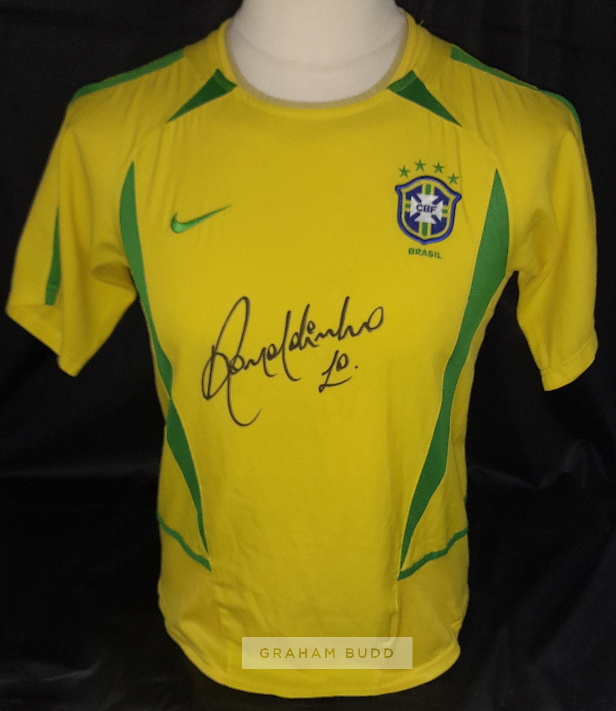 Brazil 2002 World Cup replica winning jersey signed by the enigmatic Ronaldinho boldly across front of jersey, in black sharpie, considered one of the best players of his generation and by many as the greatest of all time, he earned 97 full caps for Brazil scoring 33 goals, comes complete with COA