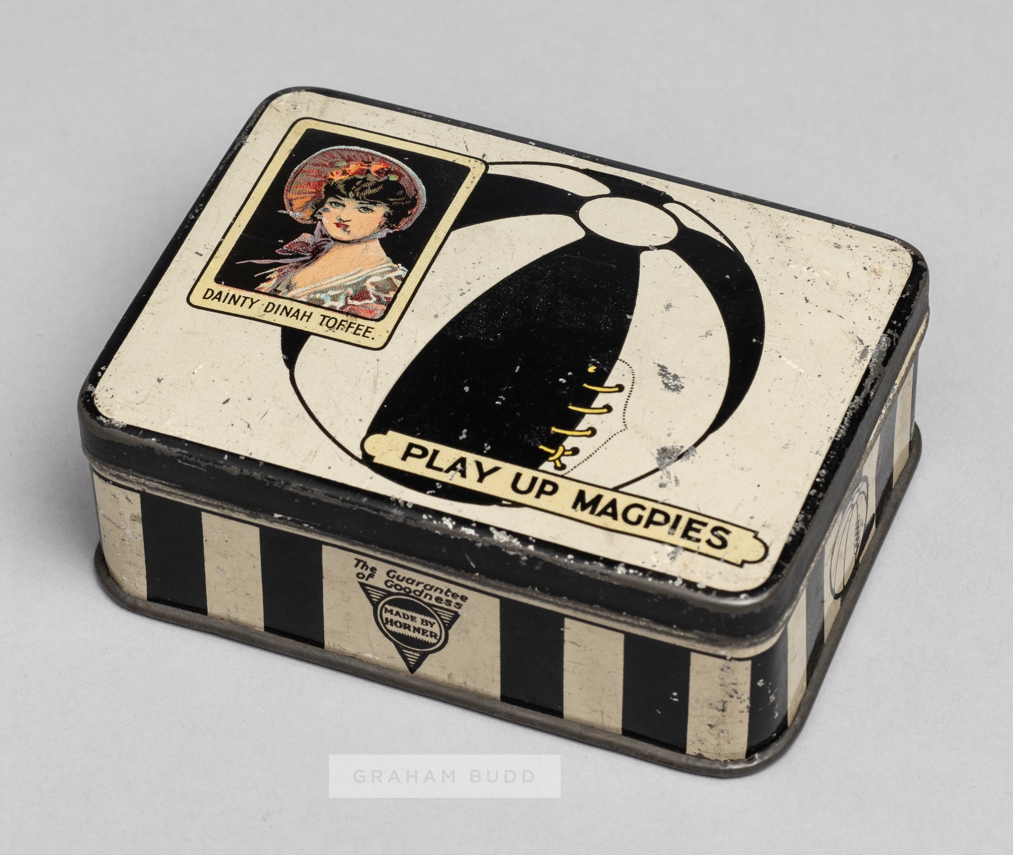 Dainty Dinah Toffee "Play Up Magpies" Newcastle United tin, circa 1900s, with black and white striped decoration, the hinged lid with a coloured image of a lady and a football with title PLAY UP MAGPIES, 3.5 by 10 by 7.5cm., bears wear and dents