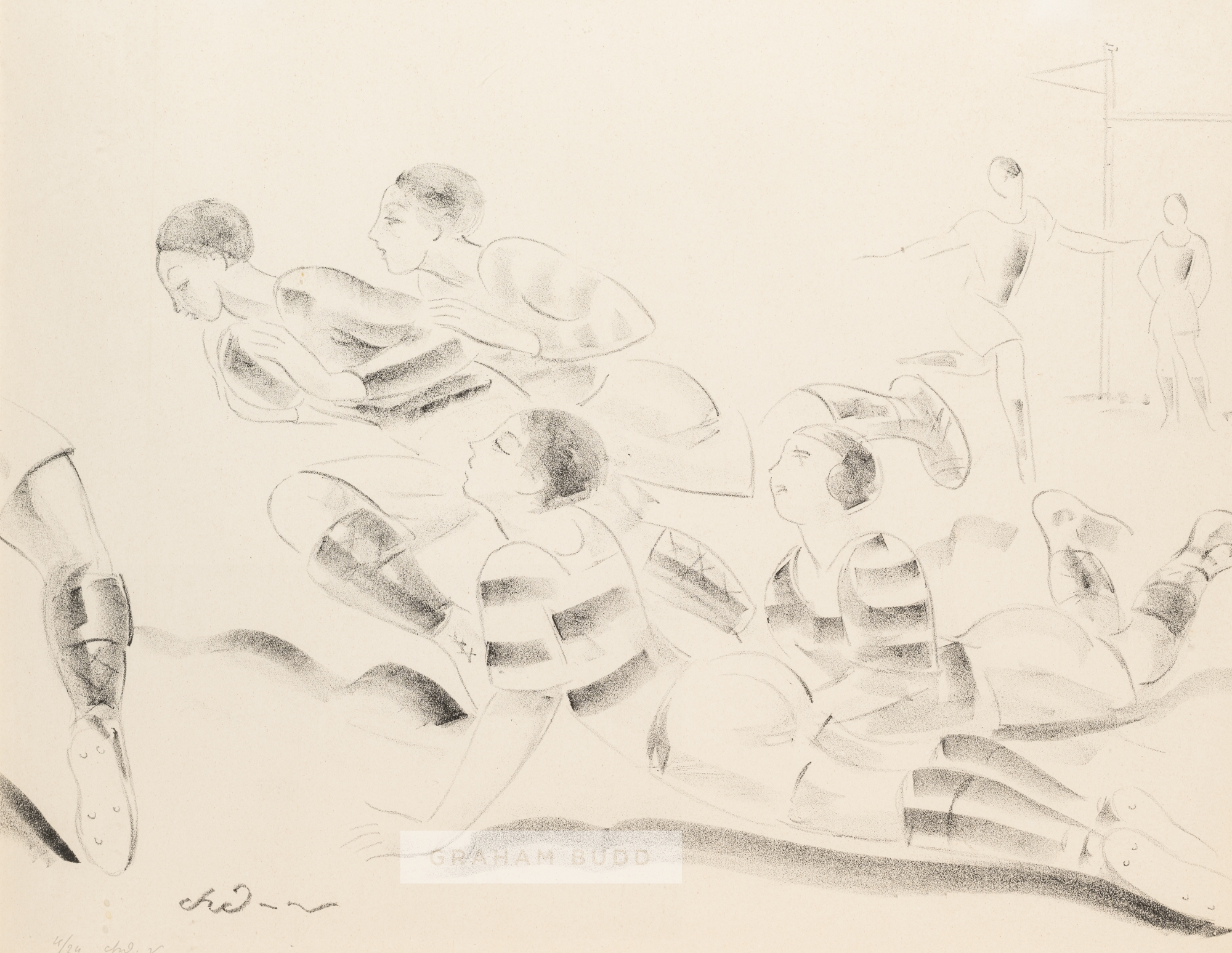 Scene of a rugby match by Charaund Nauvac, circa 1930, stylized lithograph, featuring rugby players going for the try line, indistinctly signed, limited edition 4 of 24, mounted, glazed and framed, overall 65 by 76cm. From a series of depictions of various sports by the French lithographer Charaund. Please be aware all glass will be removed from framed and glazed items prior to posting and may result in delays to shipping your items. (This service is included in the cost of postage and packing). We can also totally remove all framing and mounts upon request to reduce shipping costs. Alternatively lots can be collected in person by prior appointment from NN8 1RT.