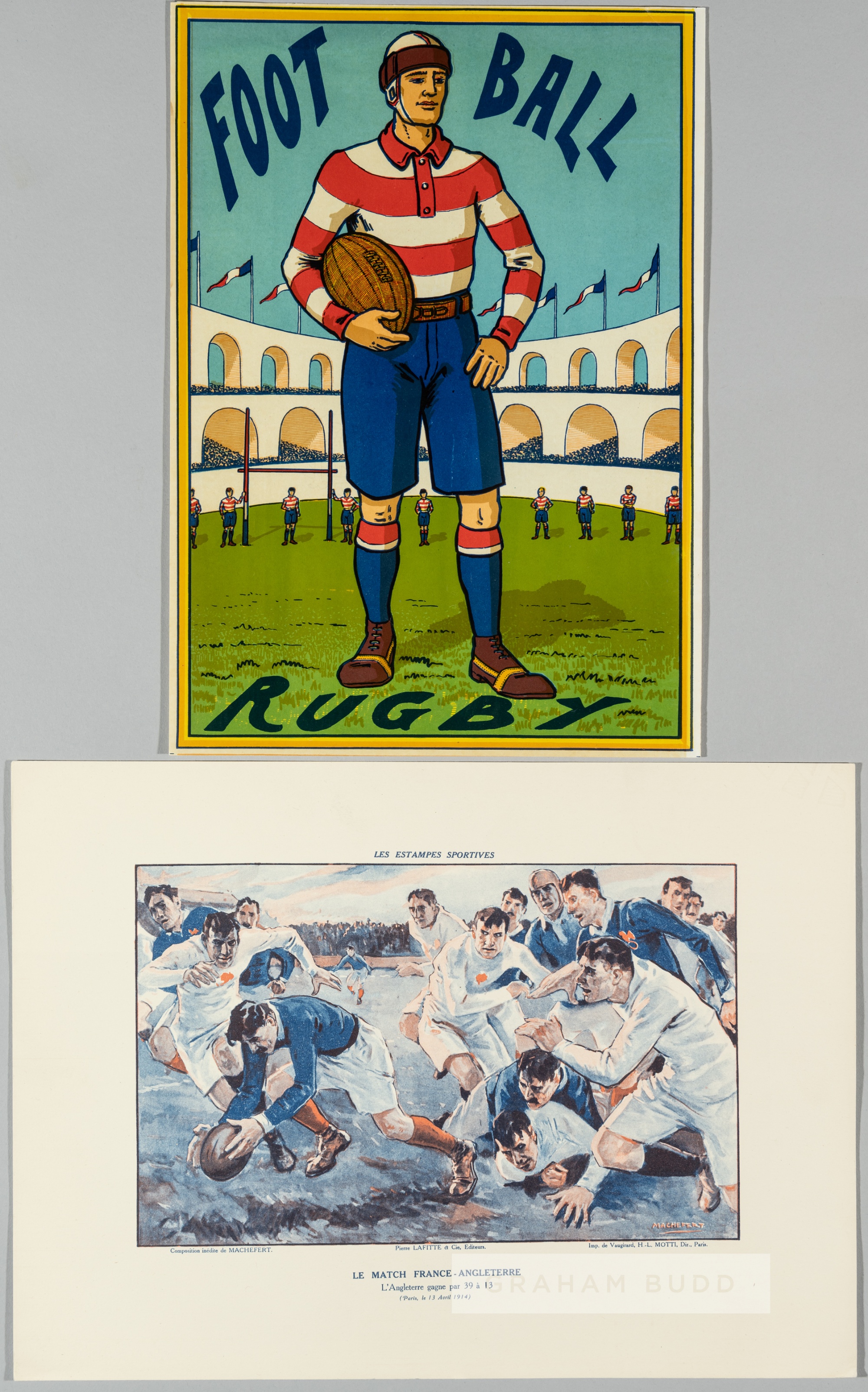 Two mid-20th century French rugby prints, the first a lithographic illustration by Machefert of a France v England rugby match, "sports prints", 30