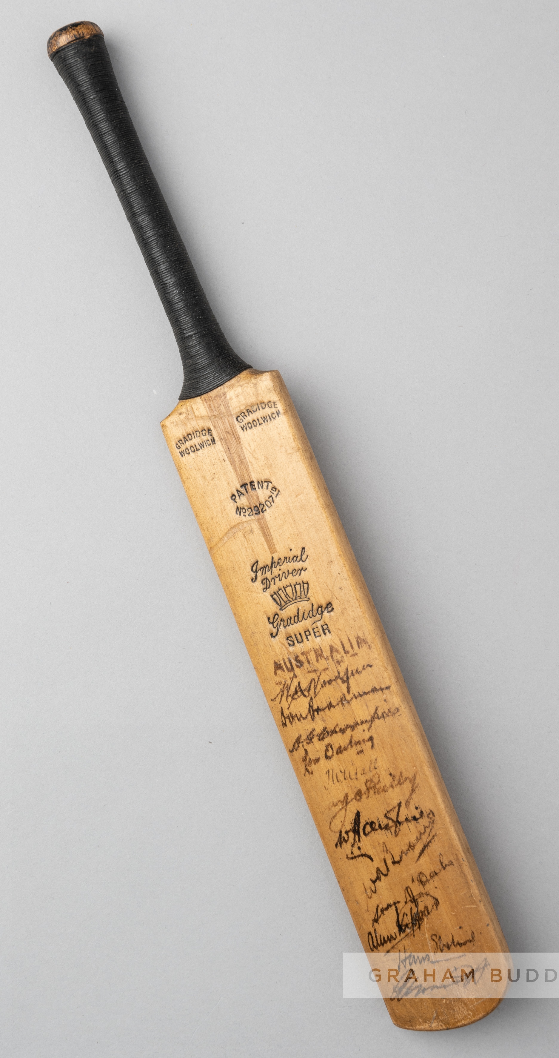 The Ashes 5th test England v Australia signed miniature cricket bat, held at the Oval on 18th August 1934, the Imperial Driver Gradidge Super bat signed by both teams on either side of the bat. Includes signatures of England's RES Wyatt, M Leyland, CF Walters, FE Woolley, GOB Allen and Australia's Don Bradman, WM Woodfull, AF Kippax and many more. Reverse of the bat stamped 18/22-8-1934 Australia won the five test series 2-1.