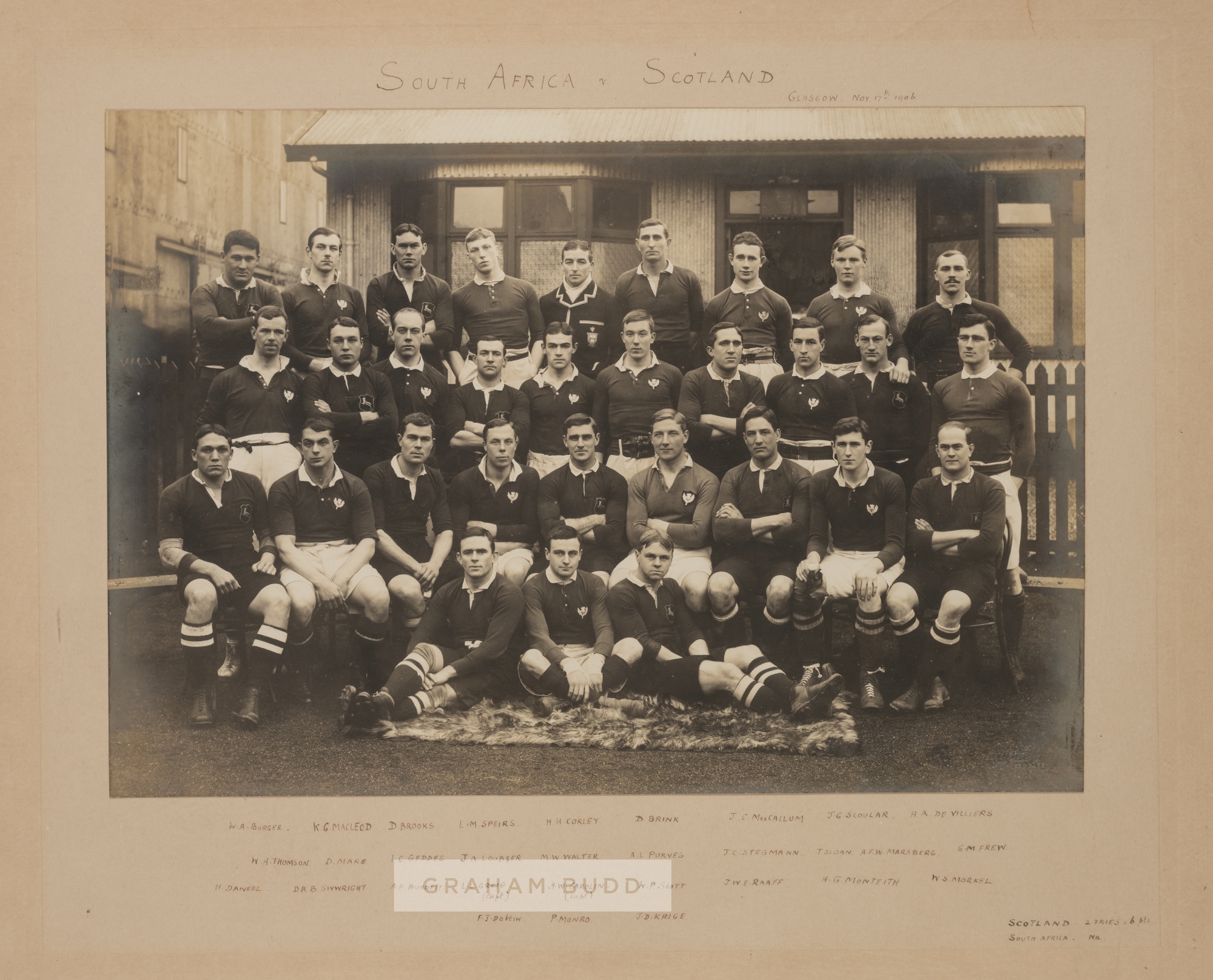 South Africa v Scotland team photograph taken prior to the first rugby test match between the countries, played at Hampden Park, Glasgow, 17th November 1906, the photograph featuring both teams in seated and standing pose in front of the club house taken prior to the match, with written legend below, mounted on card in a glazed frame, overall 48 by 59cm. Scotland defeated South Africa 2 tries 6 points to nil. This fixture was the first in the South African international tour of Scotland, Ireland, Wales and England. They defeated Ireland, lost to Wales and drew with England. Players include: WA Burger, KG Macleod, D Brooke, LM Speirs, MH Corley, D Brink, JC MacCallum, JG Scoular, HA De Villiers, WH Thompson, D Mare, IG Geddes, JA Loubser, MW Walter, AL Purves, JC Stegmann, T Sloan, AFW Marsberg, GM Frew, H Daniel, DRB Siywright, AF Burdett, LL Greig (capt), JW Carolin (capt), WP Scott, JWE Raaff, HG Monteith, WS Morkel, FJ Doffin, P Munro and JD Krige Please be aware all glass will be removed from framed and glazed items prior to posting and may result in delays to shipping your items. (This service is included in the cost of postage and packing). We can also totally remove all framing and mounts upon request to reduce shipping costs. Alternatively lots can be collected in person by prior appointment from NN8 1RT.