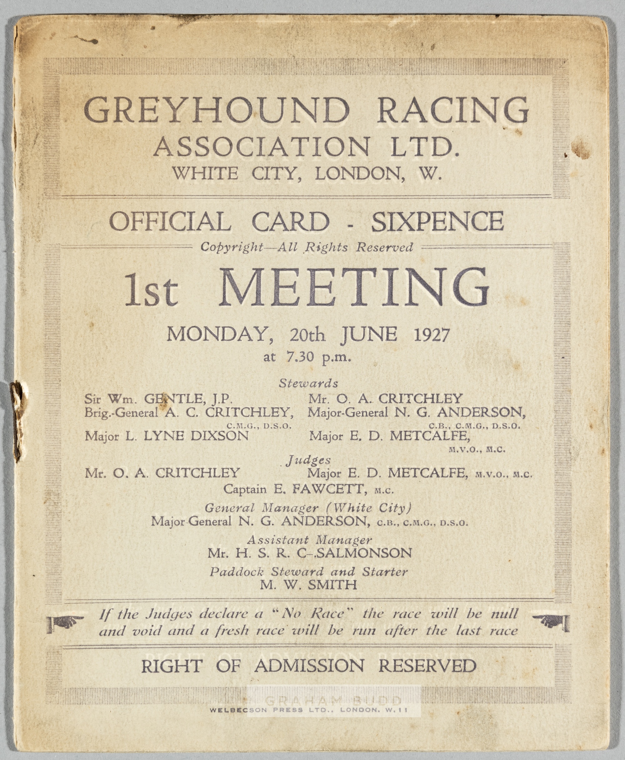 Rare White City greyhound racing first meeting race card, 20th June 1927, eight-page card with eight race details, bears wear, cover with discoloured