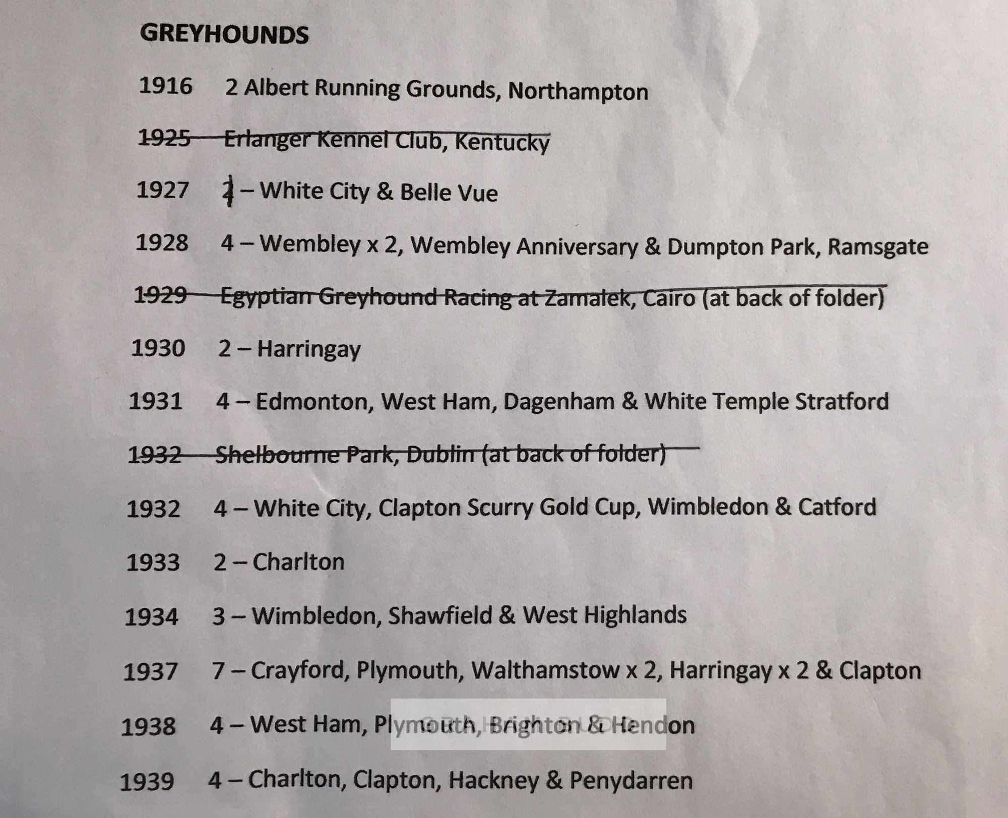 Collection of Greyhound race cards, dating from 1927 to 1939, including Belle Vue, Manchester 77th meeting 3rd October 1927; Dumpton Park, Ramsgate 52nd meeting 6th October 1928, Wembley 168th meeting 8th December 1928; Wembley Anniversary 169th meeting 10th December 1928; Wembley 175th meeting 28th December 1928; Harringay Park 1st meeting 3rd January 1930; Harringay Park 4th meeting 24th January 1930; White Temple Stadium 2nd July 1931; Dagenham stadium 20th September 1931; Edmonton Stadium 22nd November 1931; West Ham Stadium 136th meeting 14th December 1931; Clapton stadium Scurry Gold Cup Souvenir 6th August 1932; Wimbledon 107th meeting 7th September 1932; Catford 22nd meeting 16th September 1932; White City Stadium, Liverpool 5th November 1932; Charlton Stadium 931 meeting 14th May 1933; Shawfield track 587th meeting 6th October 1934; Wimbledon 64th meeting 23rd May 1934; Western Highlands race meeting 9th August 1935; and many more, each bearing wear, (qty)