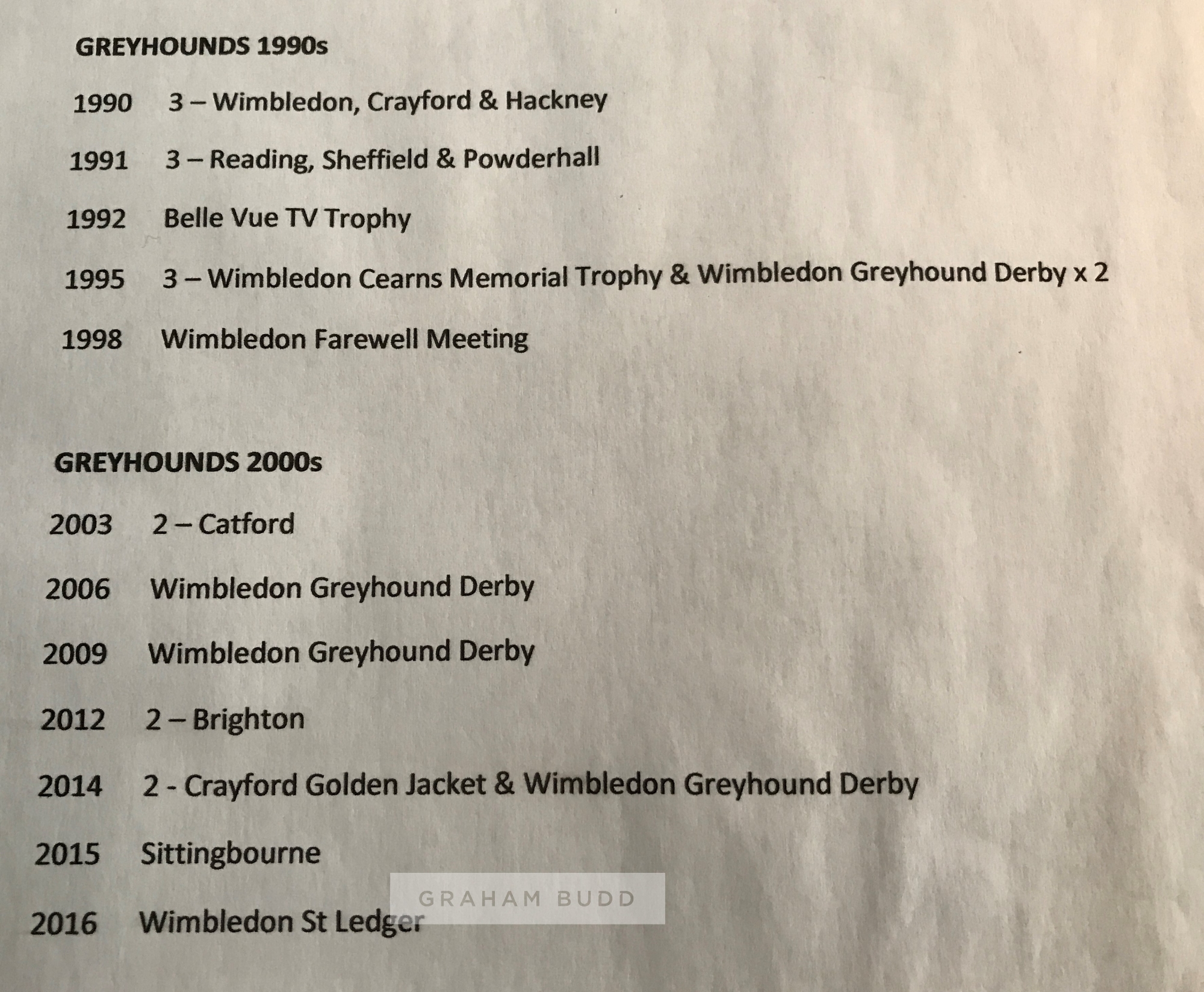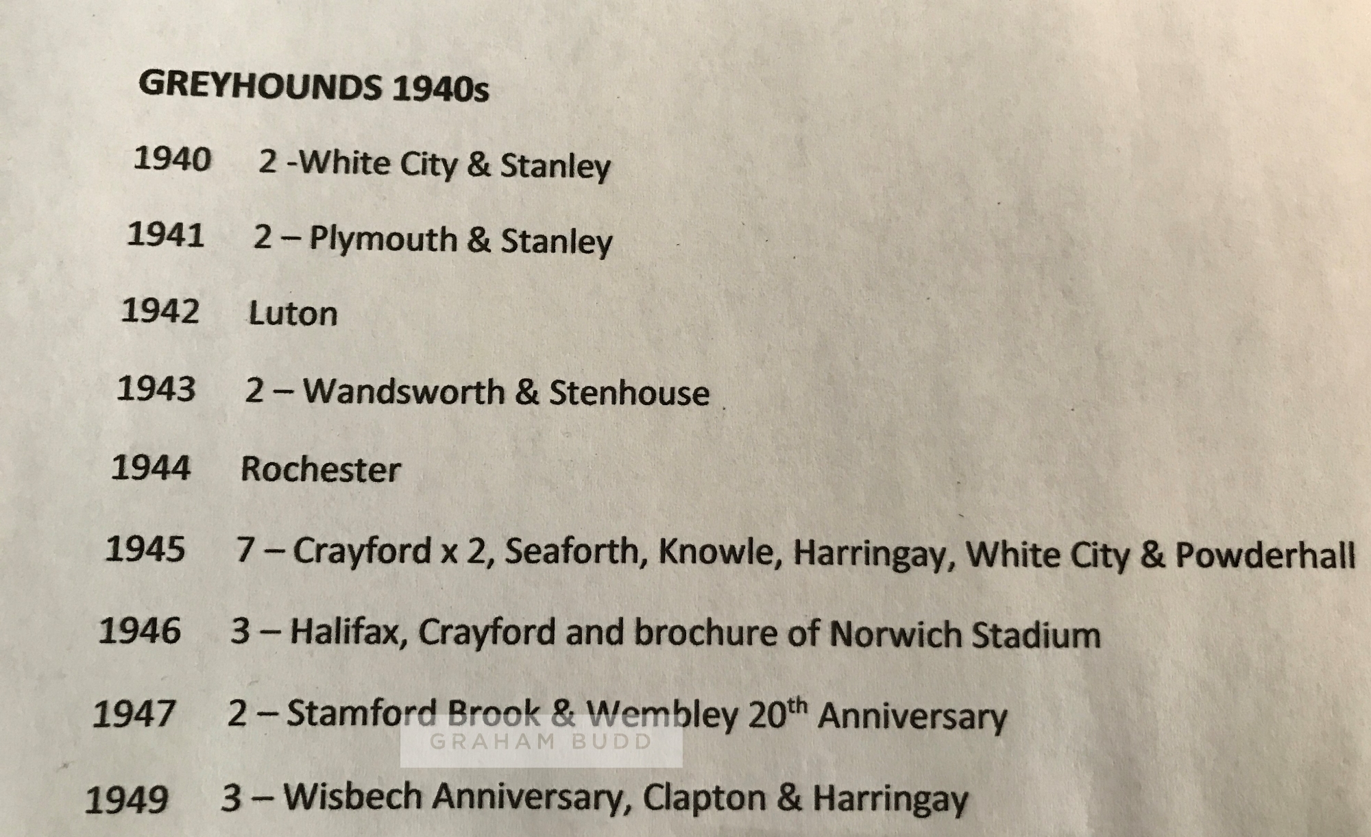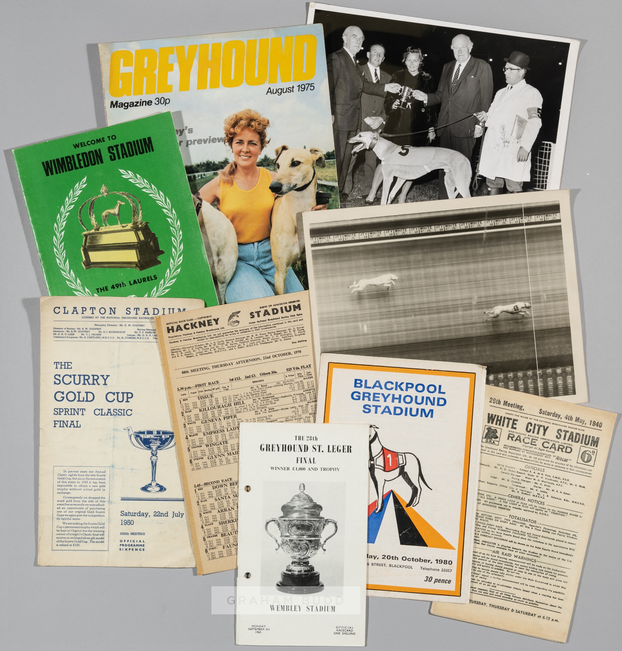 Collection of Greyhound race cards dating from the 1940s to 2000s, including race cards from meetings at White City, Luton, Crayford, Wisbech Anniversary, Harringay, Wimbledon, Wembley, West Ham, Kingsheath, Catford, Leeds, Rochester, Gloucester, Milton Keynes, Bristol and many more, all contained in albums; sold together with a set of B. Morris & sons Forecasta racing greyhound cigarette cards, lacking no.2; two b & w press photographs of the finish line and presentation of the Blue Ribband Stakes at Wembley, taken on 16th October 1968; selection of Greyhound monthly magazine from 1975 to 1986, not a complete run, (qty)