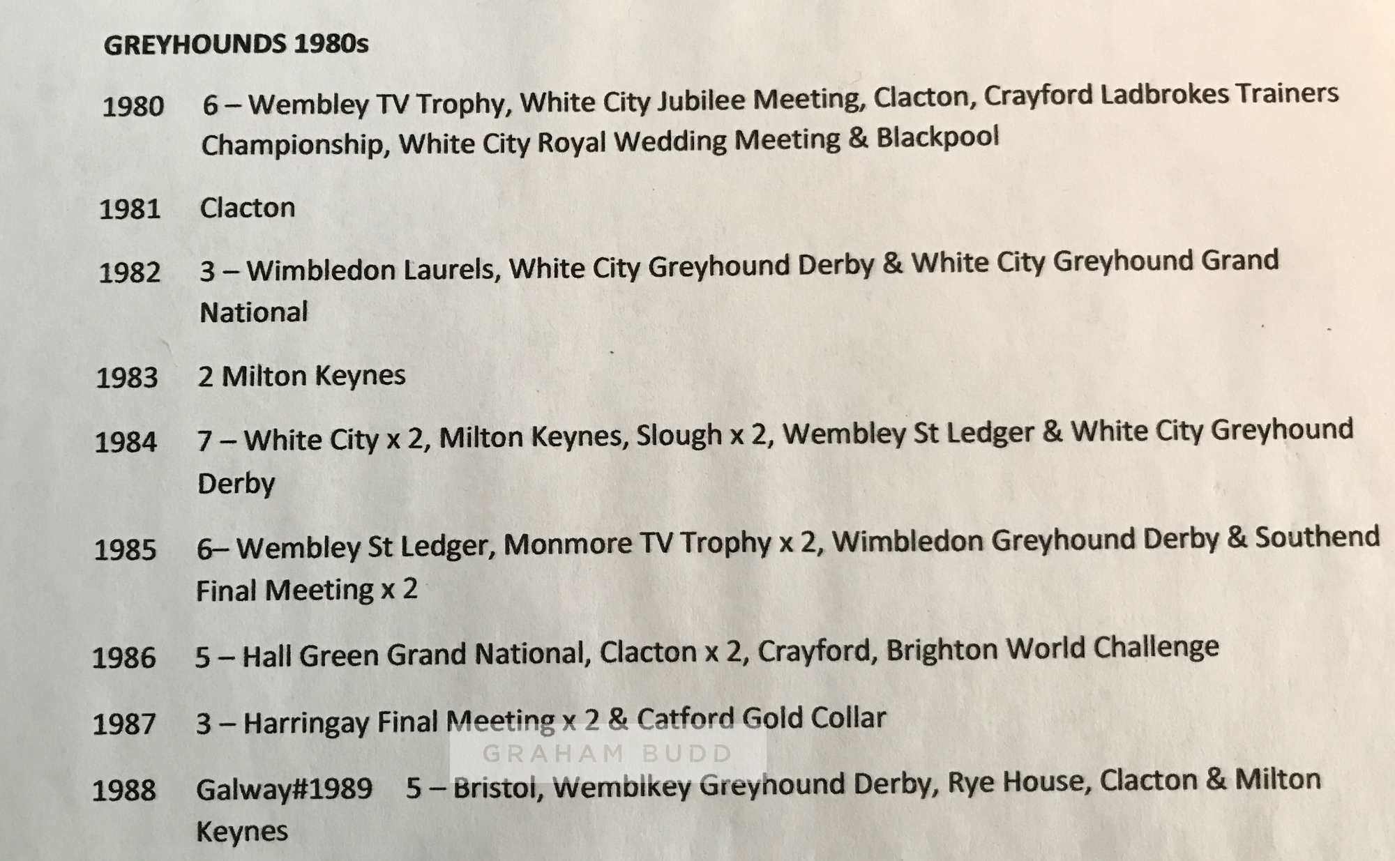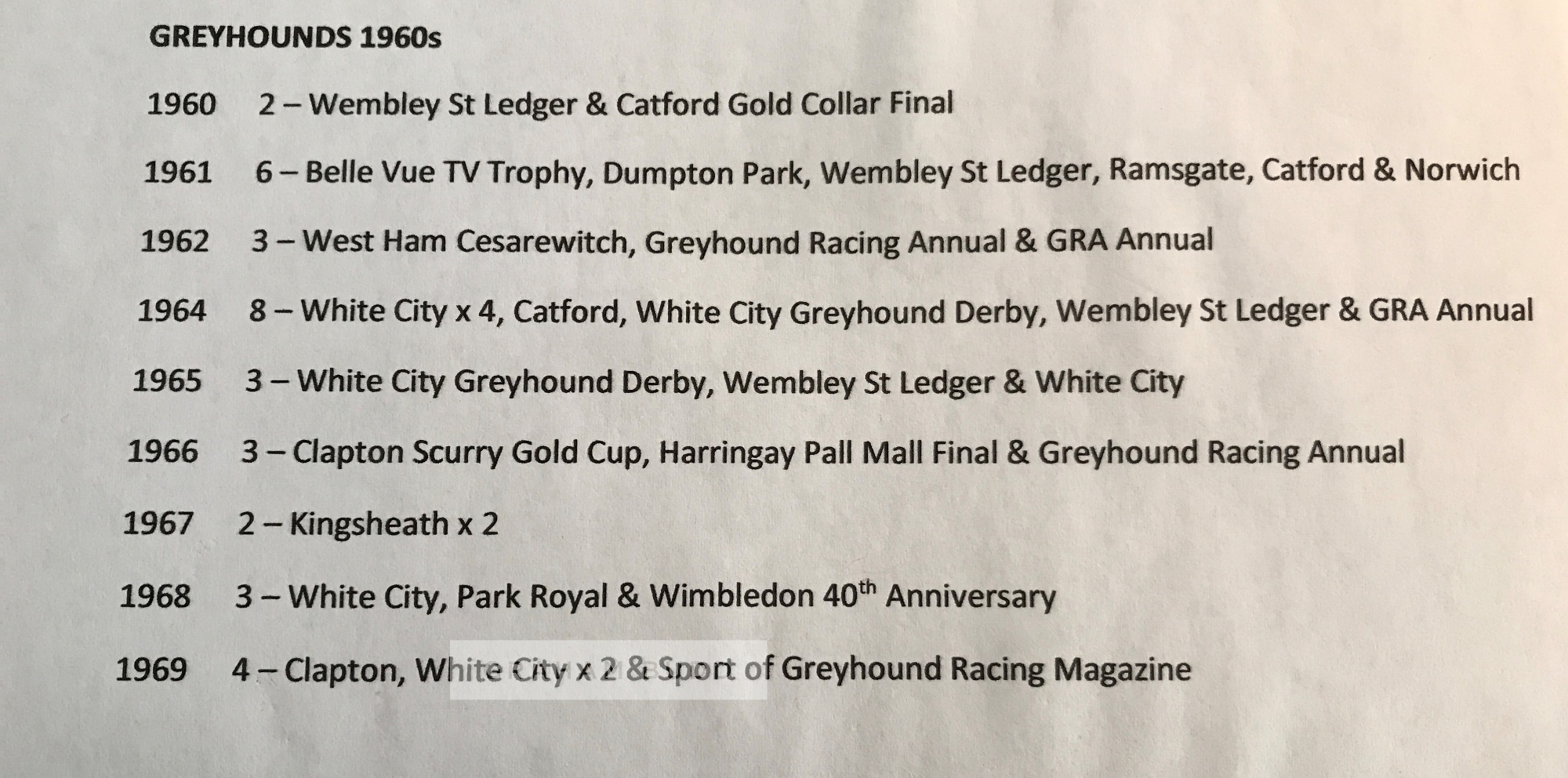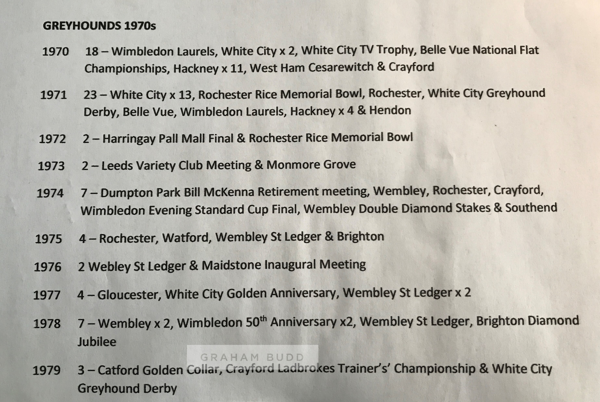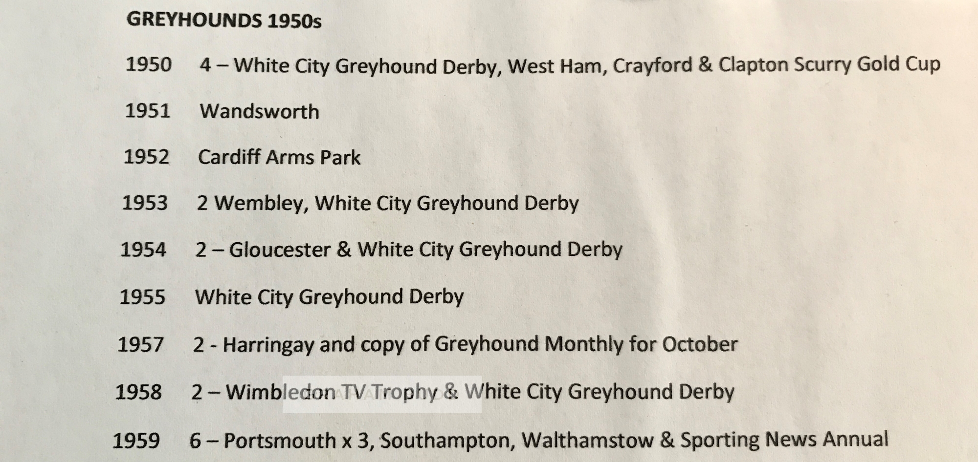 Collection of Greyhound race cards dating from the 1940s to 2000s, including race cards from meetings at White City, Luton, Crayford, Wisbech Anniversary, Harringay, Wimbledon, Wembley, West Ham, Kingsheath, Catford, Leeds, Rochester, Gloucester, Milton Keynes, Bristol and many more, all contained in albums; sold together with a set of B. Morris & sons Forecasta racing greyhound cigarette cards, lacking no.2; two b & w press photographs of the finish line and presentation of the Blue Ribband Stakes at Wembley, taken on 16th October 1968; selection of Greyhound monthly magazine from 1975 to 1986, not a complete run, (qty)