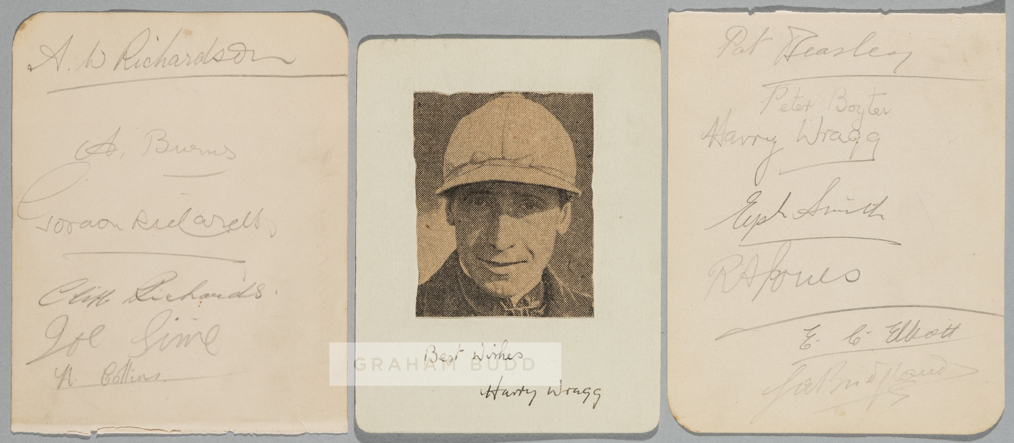 Autographs of famous flat race jockeys from the 1930s onwards, two album pages and one photocopy of b & w photograph laid on card, signatures include Eph Smith, Gordon Richards, Cliff Richards, Pat Beasley, Tommy Lowrey, Edward 'Charlie' Elliott, Harry Wragg (2), Fred Herbert, Geoff Littlewood, Archie Burns and Robert Jones