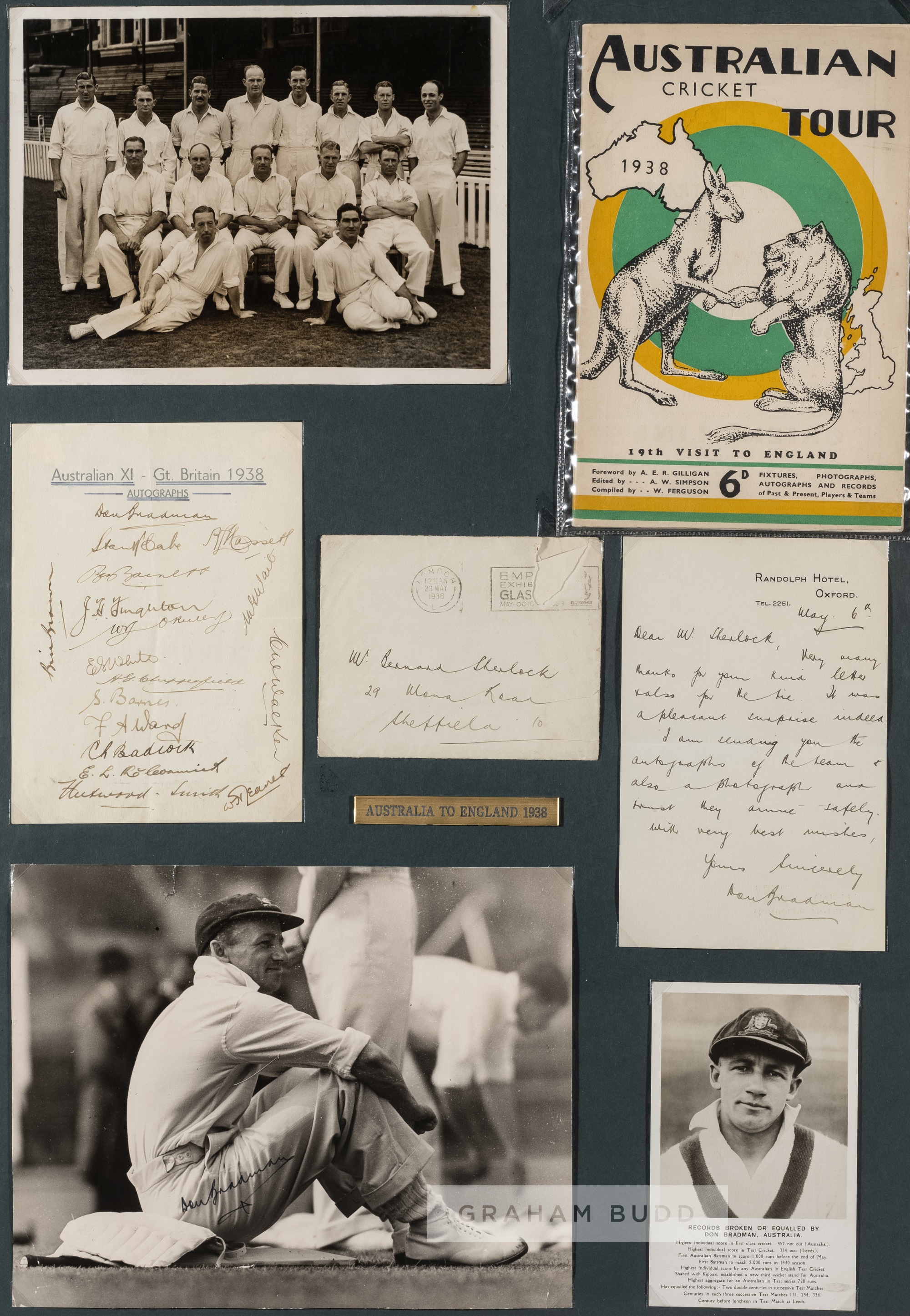Signed Don Bradman's 1938 Australian XI cricket tour to England display, comprising Australian cricket tour programme; 6.5 by 8.5in. b & w photograph of the Australian team; Don Bradman signed 7.5 by 9.5in. b & w of Bradman seated on the pitch; 5 by 3.5in. b & w player profile photograph with career record; a team signed autograph album page bearing 17 signatures including Bradman, Badcock, Smith, Barnett, Barnes, and others; a hand-written letter with envelope in black ink from Don Bradman to Bernard Sherlock discussing sending Sherlock a team signed autograph page and photograph Mounted, glazed and framed, overall size 75 by 58cm. Please be aware all glass will be removed from framed and glazed items prior to posting and may result in delays to shipping your items. (This service is included in the cost of postage and packing). We can also totally remove all framing and mounts upon request to reduce shipping costs. Alternatively lots can be collected in person by prior appointment from NN8 1RT.