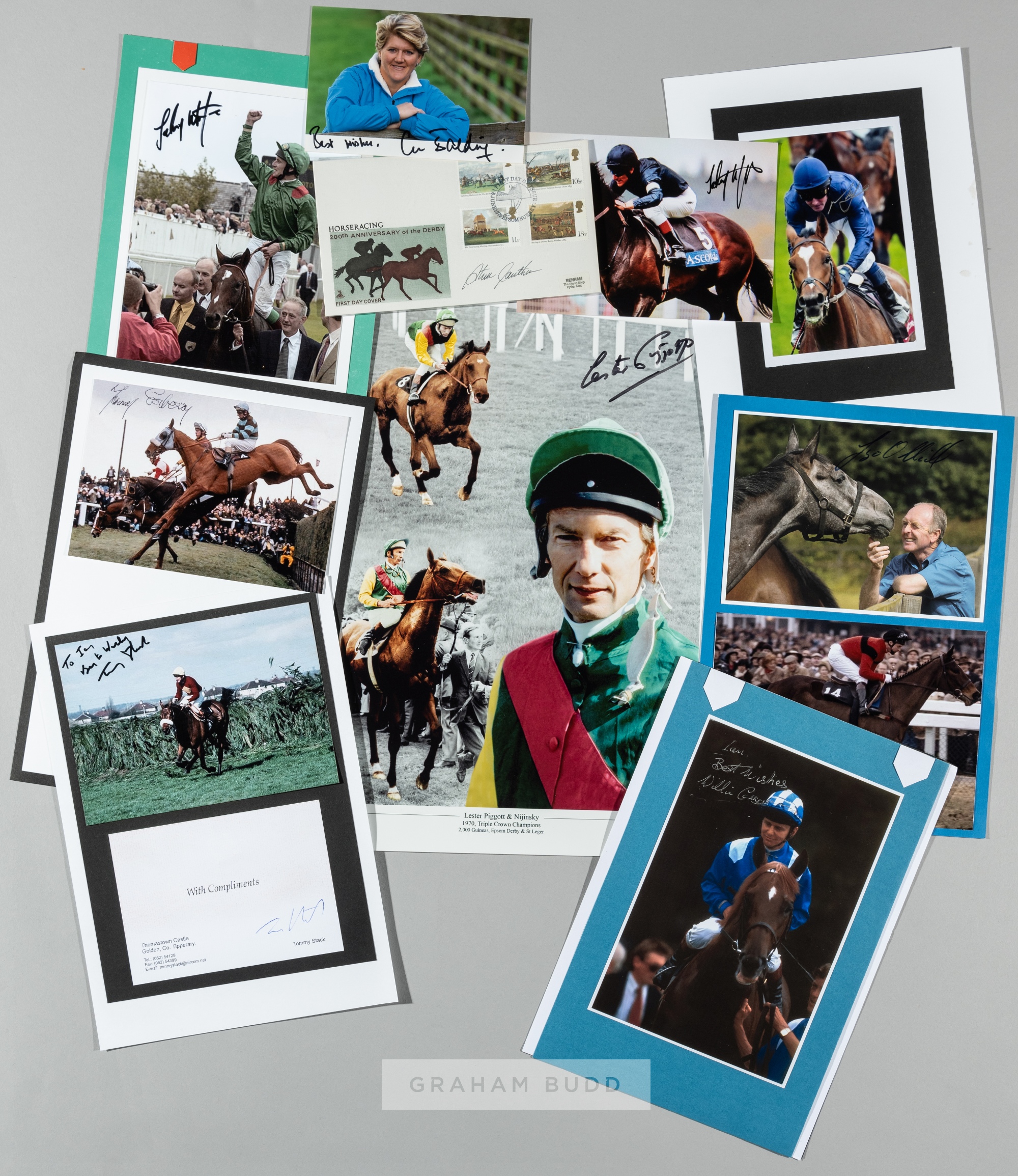 Collection of horse racing autographs, including Frankie Dettori and Richard Hughes signed autobiographies, Nijinsky signed by Lester Piggott, and numerous signed pictures and photographs of leading jockeys and trainers including AP McCoy, Willie Carson, John Jo O'Neill, Ryan Moore, Sir Michael Stoute, Richard Dunwoody, Paul Nicholls, John Gosden, William Buick, Nicky Henderson, Johnny Murtagh, Luca Cumani, David Elsworth, Steve Cauthen, Mick Kinnane, Mark Johnston, and many others, (qty)
