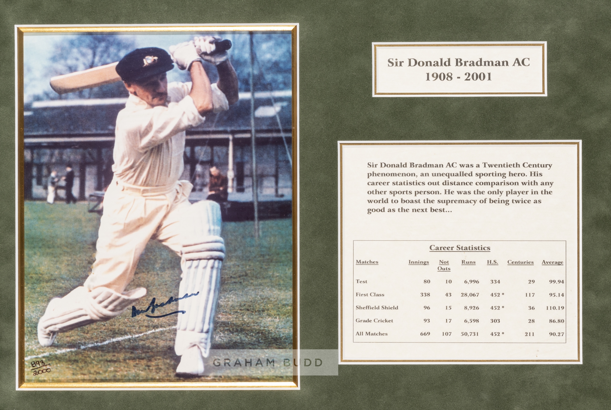 Sir Don Bradman signed colour photograph display The image portraying a front foot drive in the nets during the 1948 tour. Signed in blue marker pen, mounted besides career statistics and title plaque, published by the Bradman Museum in 2000, this issue numbered 893. Mounted, framed & glazed, 52 by 63.5cm. Please be aware all glass will be removed from framed and glazed items prior to posting and may result in delays to shipping your items. (This service is included in the cost of postage and packing). We can also totally remove all framing and mounts upon request to reduce shipping costs. Alternatively lots can be collected in person by prior appointment from NN8 1RT.