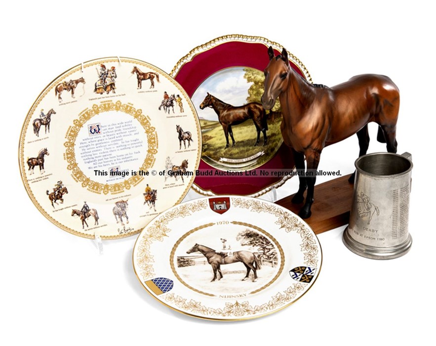 A group of horse racing collectibles, comprising: a Beswick model of Arkle; a boxed limited edition Spode plate of Brigadier Gerard (166/250); a boxed limited edition Spode plate of Nijinksy (605/1,000); a boxed Aynsley plate titled "The Horse"; and a pewter mug listing Derby winners until 1973, condition of the pewter tankard is fair with surface scratches and two dents in the side and on the lower rim, the horse bears a chip to the ear, minor surface scratches, (5)