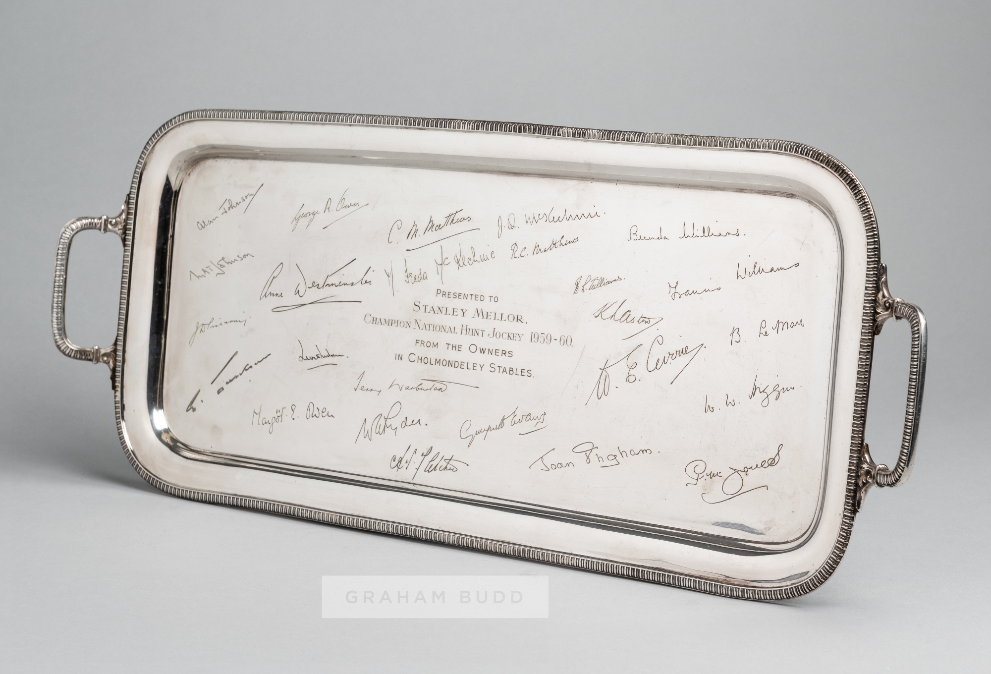 A silver twin-handled tray presented by the patrons of George Owen's Cholmondeley Stables to Stan Mellor on the occasion of becoming Champion National Hunt Jockey for the first time in season 1959-60, the rectangular twin handled tray with gadrooned border inscribed PRESENTED TO STAN MELLOR CHAMPION NATIONAL HUNT JOCKEY 1959-60, FROM THE OWNERS IN CHOLMONDELEY STABLES, with facsimile signature of the owners in the Cholmondeley Stables including Francis & Brenda Williams, CM & RC Matthews, G. Evans, Joan Bingham, George R Owen, Anne Westminster, JD & Freda McKechnic, Mat & Alan Johnson, B Le Mare and many others, hallmarked Sheffield 1958 by James Dixon & Sons Ltd, 22 by 55cm., weight 1500gms., minor wear with surface marks, sold with a b & w 10 by 13cm. photograph of Stan Mellor on the day he won his first championship beating Fred Winter by one winner, (2) Stan Mellor was crowned Champion Jump Jockey on three occasions. In season 1959-60 he rode 68 winners, in season 1960-61 with 118 winners and in season 1961-62 80 winners. Provenance: The Stan Mellor Collection