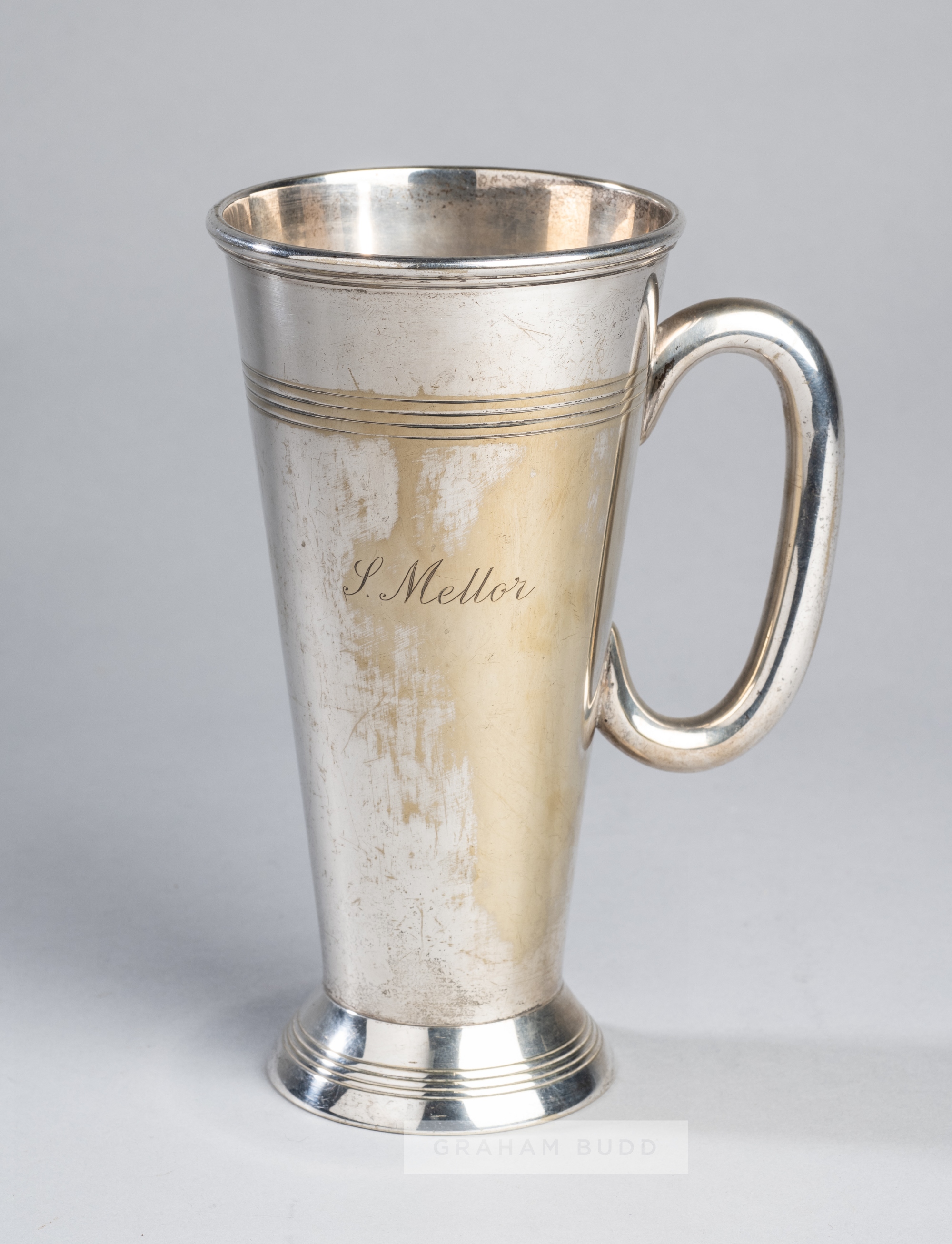 Pint tankard inscribed to to the Champion jump jockey Stan Mellor, E.P.N.S., of tapering form, engraved S. MELLOR, 18cm. high Provenance: The Stan