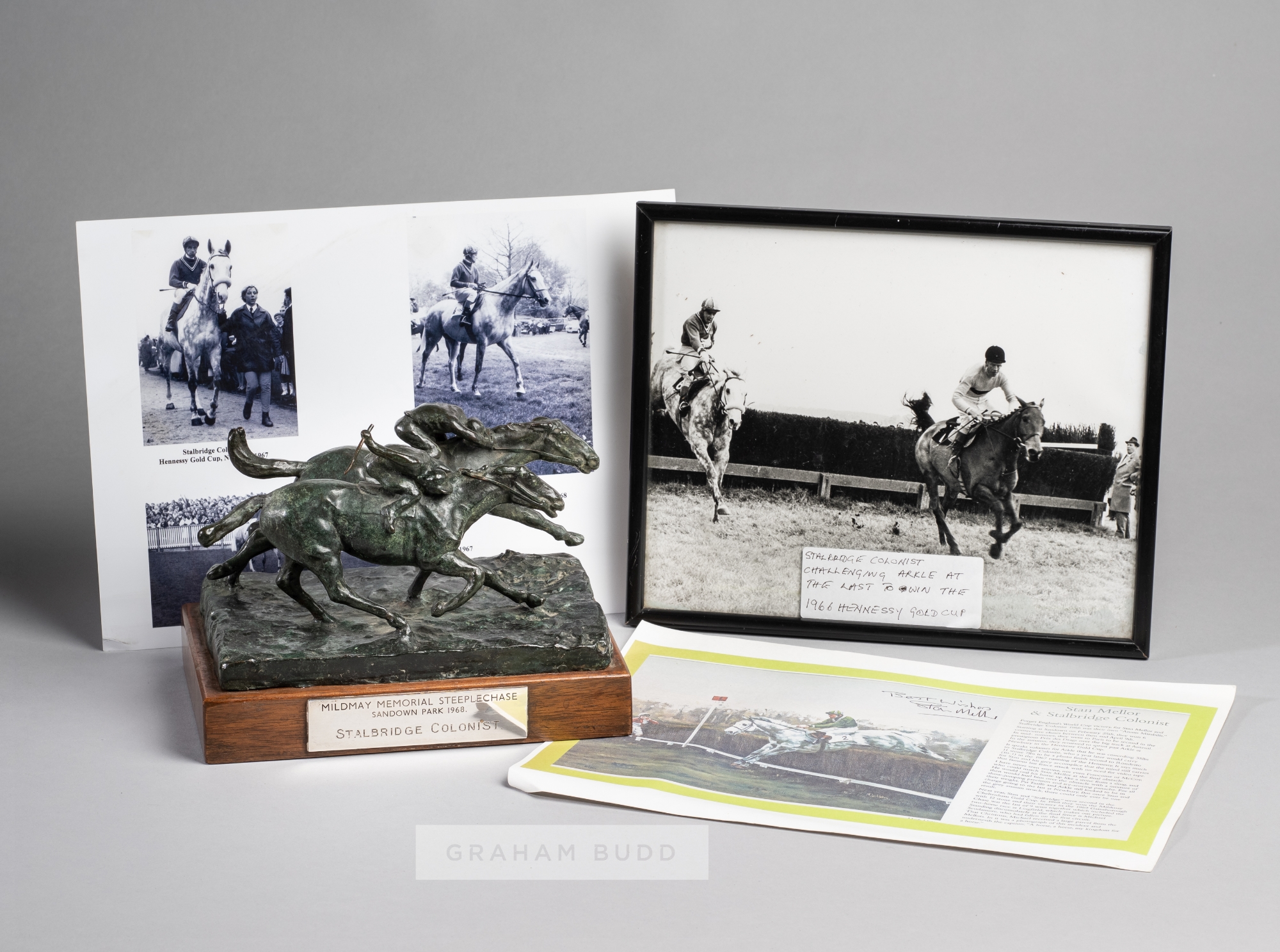 The Mildmay Memorial Steeplechase bronze trophy awarded to jockey Stan Mellor for winning on Stalbridge Colonist at Sandown Park in 1968, modelled as two racehorses with jockey's aboard riding a finish, mounted upon a wooden plinth base with engraved plaque MILDMAY MEMORIAL STEEPLECHASE SANDOWN PARK 1968 STALBRIDGE COLONIST, 14 by 20 by 12.5cm., sold with a quantity of other photographs and press cuttings relating to Stalbridge Colonist, including a signed article with image of Stan Mellor on Stalbridge Colonist, signed in black ink, a montage of three b & w photographs of Stalbridge Colonist with Stan Mellor including at the Whitbread Gold Cup 1968 and a b & w photograph of Stalbridge Colonist and Stan Mellor challenging Arkle and Pat Taaffe at the last to win the 1966 Hennessy Gold Cup, framed and glazed overall 21 by 25cm, (qty) Stalbridge Colonist was owned by Reg Blundell, Chairman of Plymouth Argyle Football Club, and trained by Ken Cundell at Compton. Provenance: The Stan Mellor Collection Please be aware all glass will be removed from framed and glazed items prior to posting and may result in delays to shipping your items. (This service is included in the cost of postage and packing). We can also totally remove all framing and mounts upon request to reduce shipping costs. Alternatively lots can be collected in person by prior appointment from NN8 1RT.