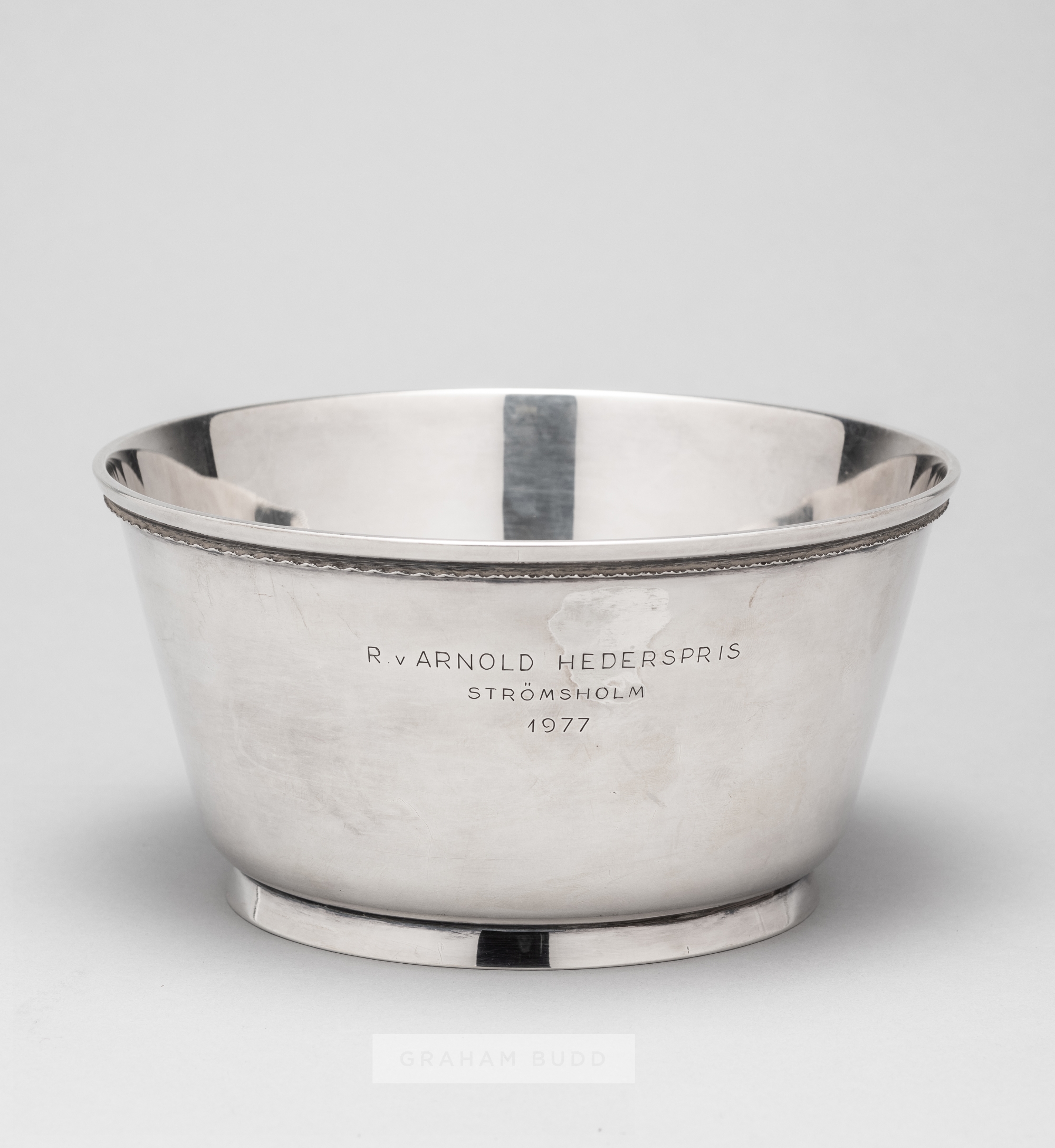 A Swedish silver racing trophy dated 1977, hallmarked Stockholm 1976, by Eric Rastrom, the flared squat bowl engraved R V ARNOLD HEDERSPRIS, STROMSHOLM, 1977, , 8 by 15.5cm., weight 320gms. Provenance: The Stan Mellor Collection