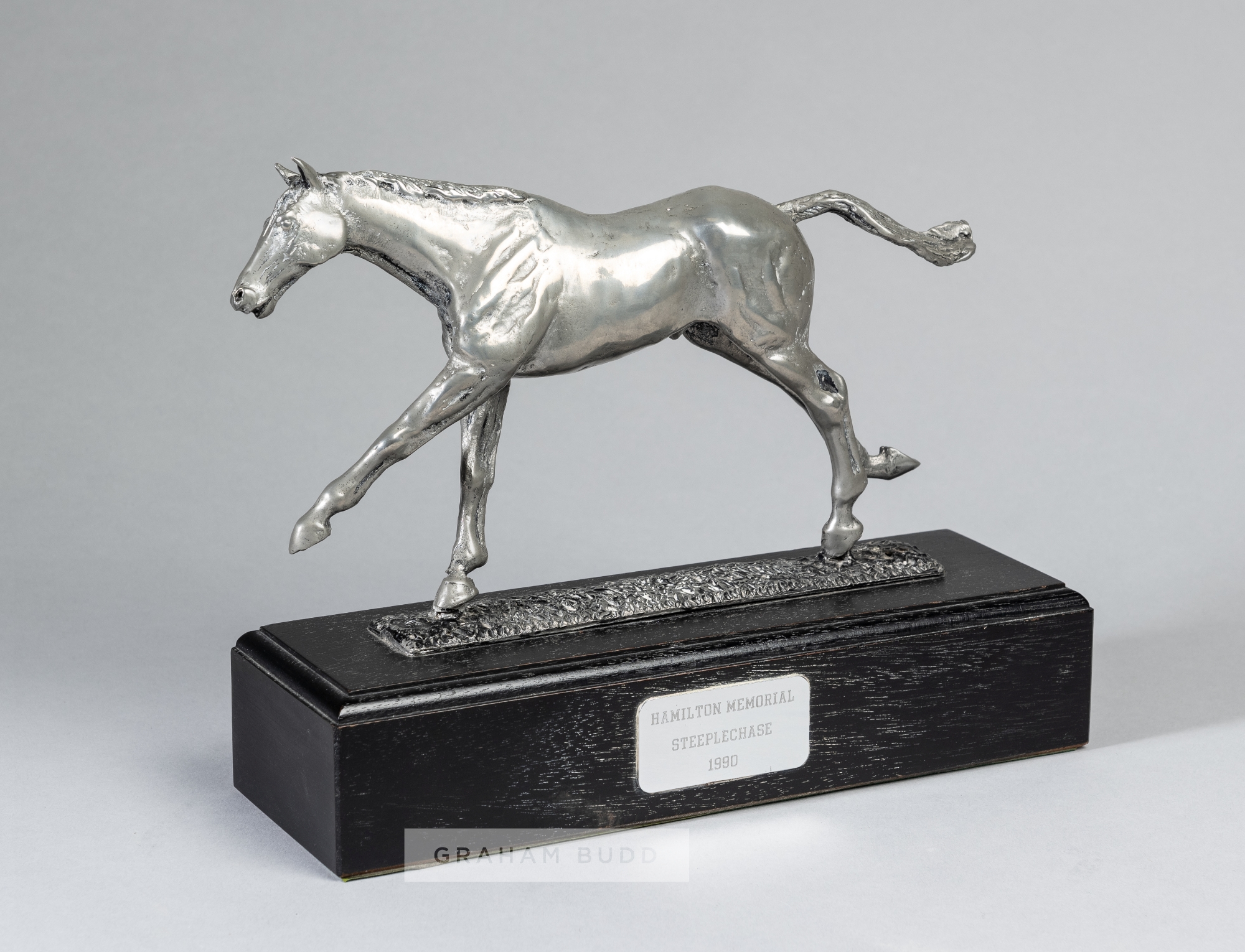 The winning trainer's trophy for the Hamilton Memorial Steeplechase at Kelso on 23rd February 1990, pewter modelled as a racehorse, raised upon a woo