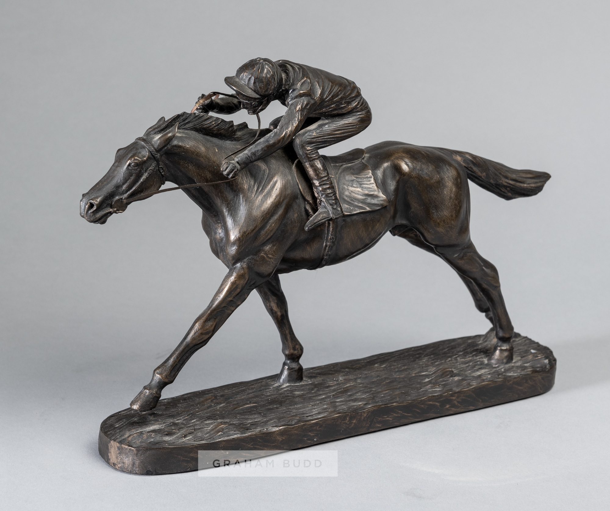 A bronze resin sculpture of a racehorse and jockey, depicting a realistic model of jockey on horseback raised upon a plinth base, bearing J SKEAPING, 20 by 26cm. Provenance: The Stan Mellor Collection