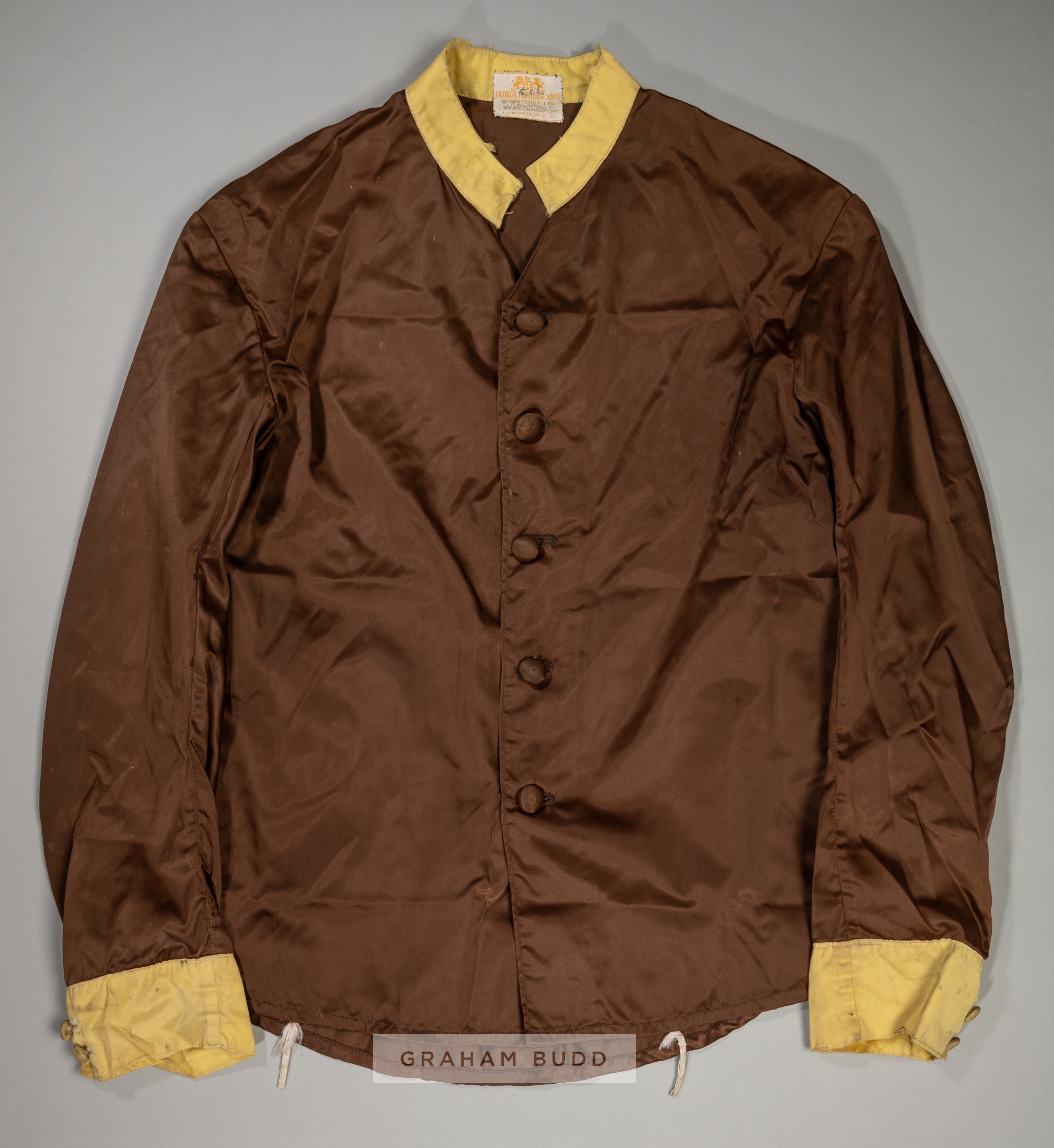 A set of Colonel William H Whitbread chocolate racing silks, with yellow collar and cuffs, bearing maker label for GEORGE PARKER & SONS LTD, LONDON,