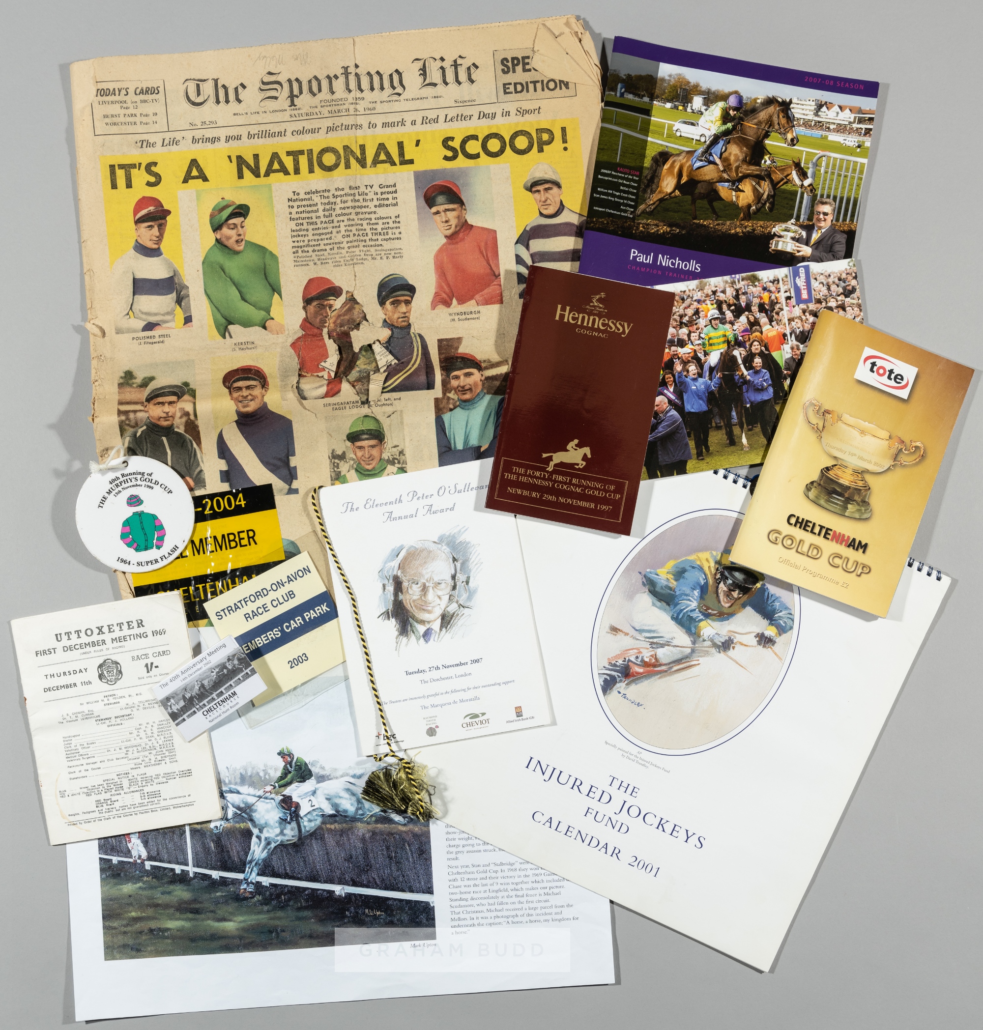A collection of ephemera from the Stan Mellor MBE collection, including race cards, menus including Peter O'Sullevan Annual awards and a private luncheon for HM The Queen at Buckingham Palace in 1972, race course carpark stickers, printed pictures, a run of injured jockey's fund calendars and a unusual colour printed edition of the Sporting Life newspaper, printed on Grand National Day 1960 and other miscellaneous items, (qty) Provenance: The Stan Mellor Collection