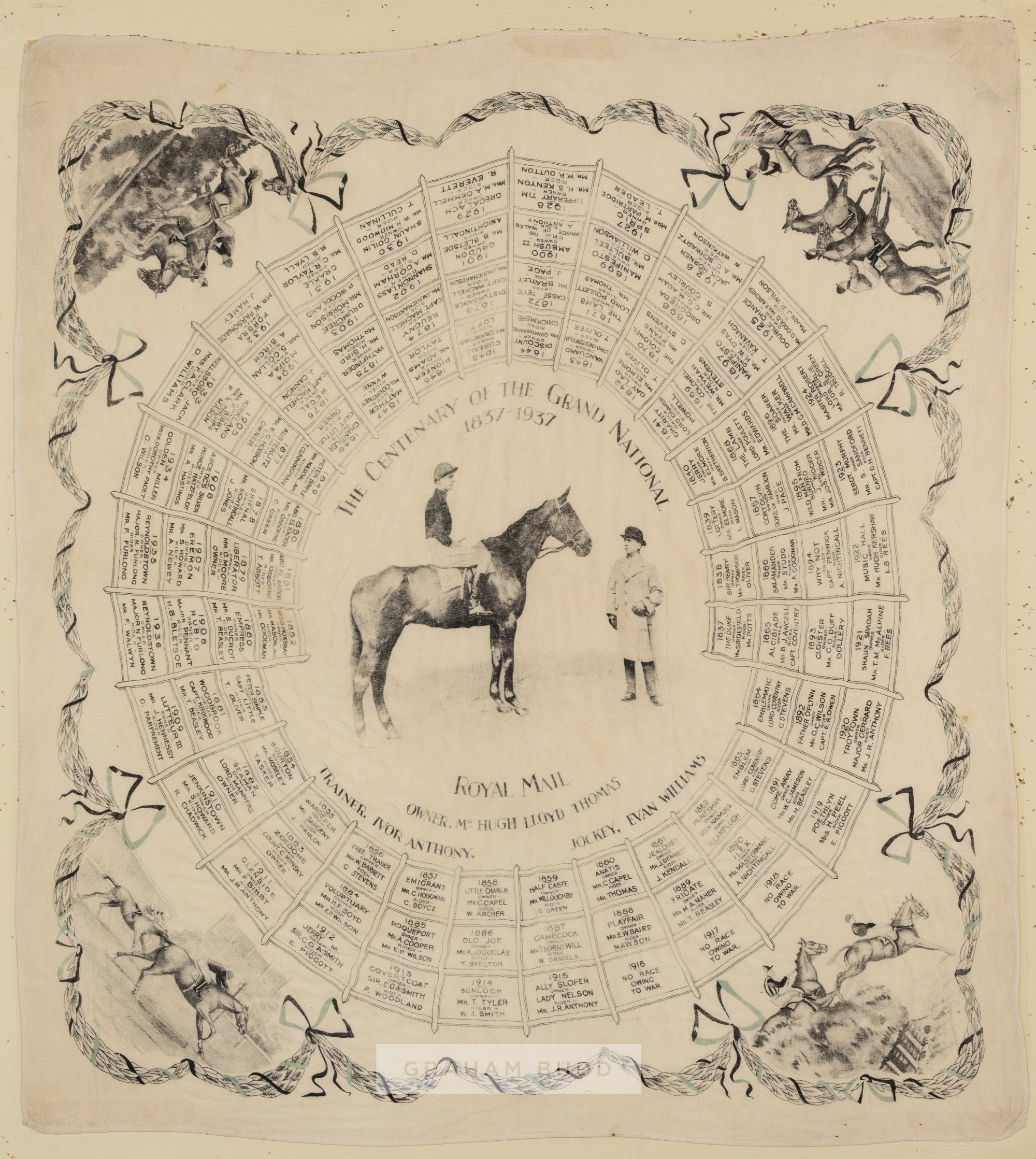 The Centenary of the Grand National 1837-1937 scarf, featuring racehorse Royal Mail with owner Hugh Lloyd Thomas, the scarf listing the names of eac