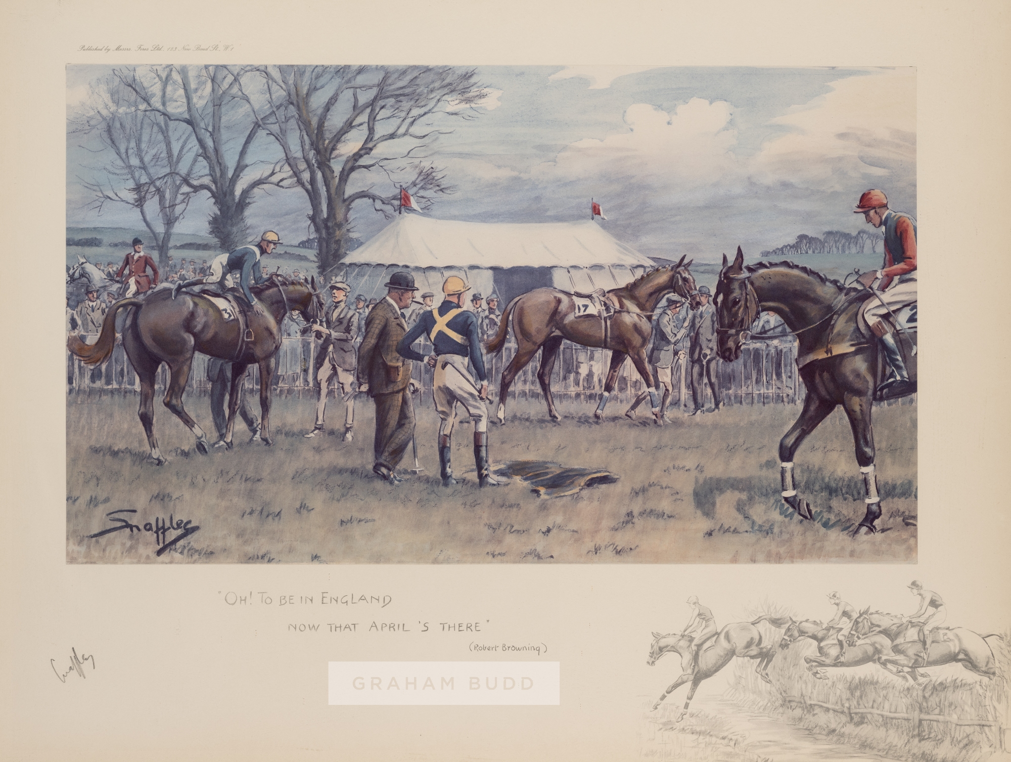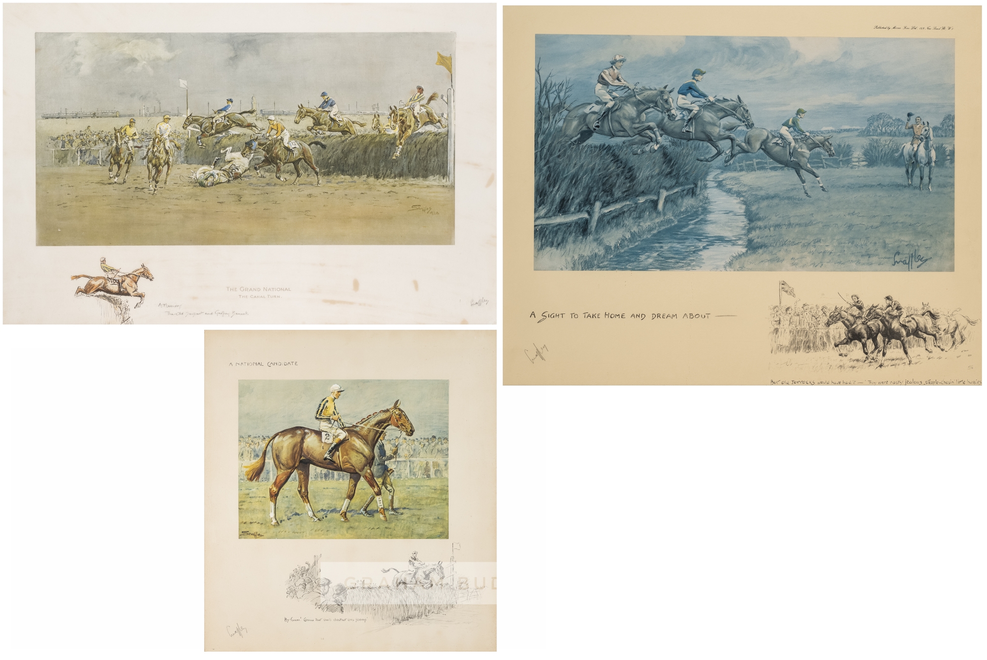 Four Snaffles prints from the Stan Mellor MBE collection, comprising OH! TO BE IN ENGLAND NOW THAT APRIL'S THERE, mounted on card, glazed and framed, overall 56 by 71cm., A SIGHT TO TAKE HOME AND DREAM ABOUT, mounted on card, glazed and framed, overall 52 by 64cm., A NATIONAL CANDIDATE, BY GROOM! CANNA THAT OW'D CHESTNUT OSS JOOMP, mounted on card, glazed and framed, overall 52 by 48cm. and THE GRAND NATIONAL THE CANAL TURN, mounted on card, glazed and framed, overall 54 by 79cm., each bearing slight wear and fading, (4) Provenance: The Stan Mellor Collection Please be aware all glass will be removed from framed and glazed items prior to posting and may result in delays to shipping your items. (This service is included in the cost of postage and packing). We can also totally remove all framing and mounts upon request to reduce shipping costs. Alternatively lots can be collected in person by prior appointment from NN8 1RT.