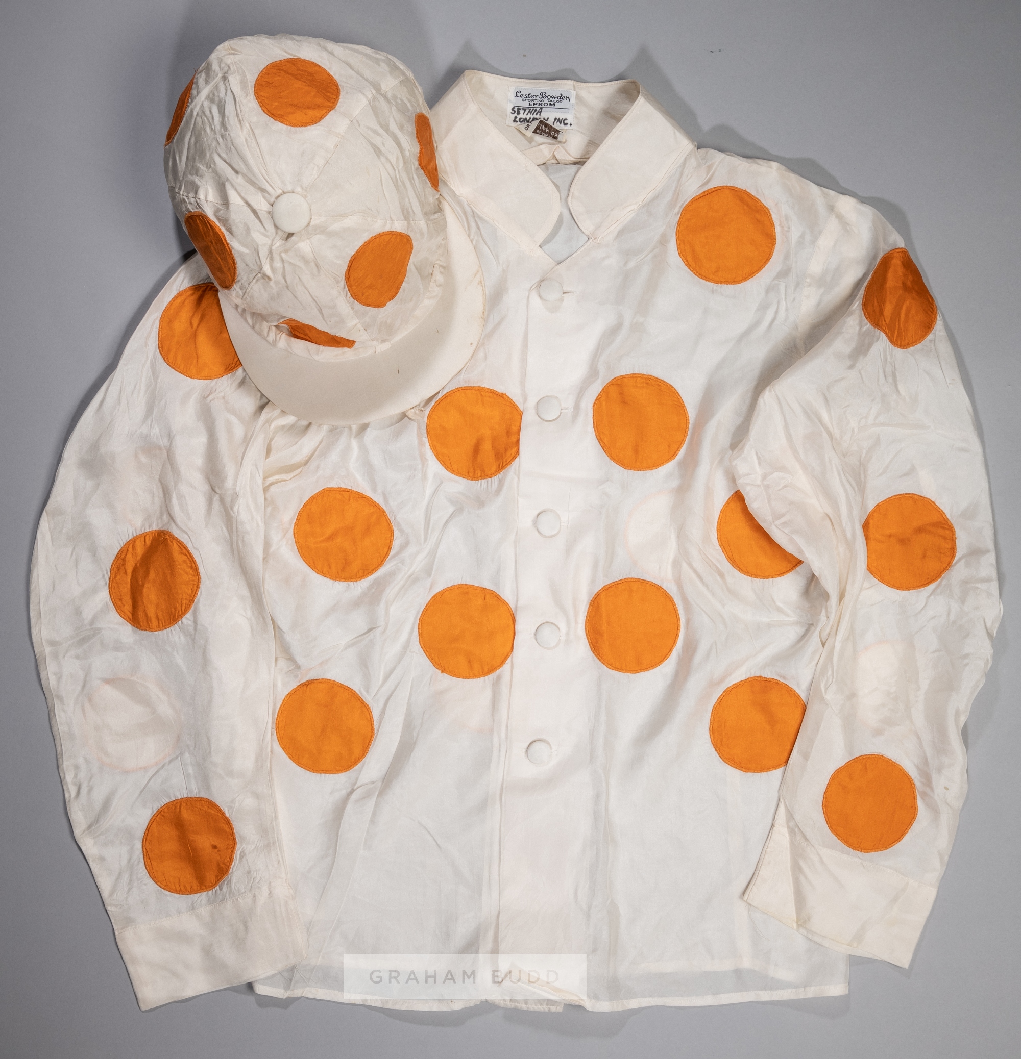 A set of Sethia London Ltd race-worn silks circa early 1980s, the ivory coloured silks with applied orange dots, bearing makers neck label for Lester Bowden Epsom, with handwritten in black marker SETHIA LONDON INC, with matching cap with makers label and annotation Sethia London Ltd was associated with the London-based business tycoon Rajendra Singh Sethia.
