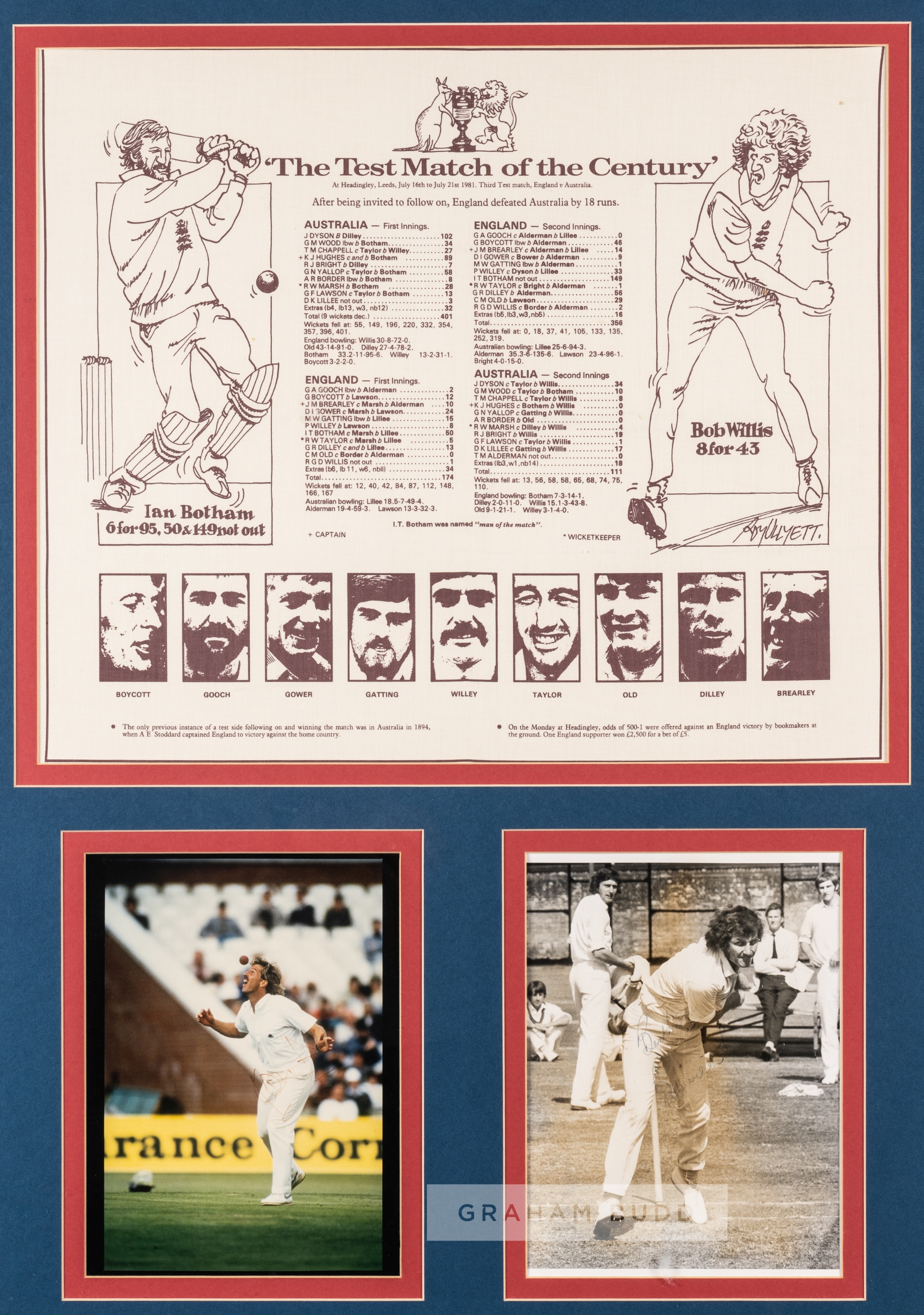 "The Test Match of the Centenary" England v Australia third test match at Headingley, Leeds, 16th - 21st July 1981 display. Comprising souvenir handkerchief printed with caricatures of Ian Botham and Bob Willis flanking the scoresheet above player portraits, mounted above two signed individual colour photographs of both cricketers, each signed in pen, both signatures faded slightly. Glazed and framed, overall size 91 by 69cm. Please be aware all glass will be removed from framed and glazed items prior to posting and may result in delays to shipping your items. (This service is included in the cost of postage and packing). We can also totally remove all framing and mounts upon request to reduce shipping costs. Alternatively lots can be collected in person by prior appointment from NN8 1RT.