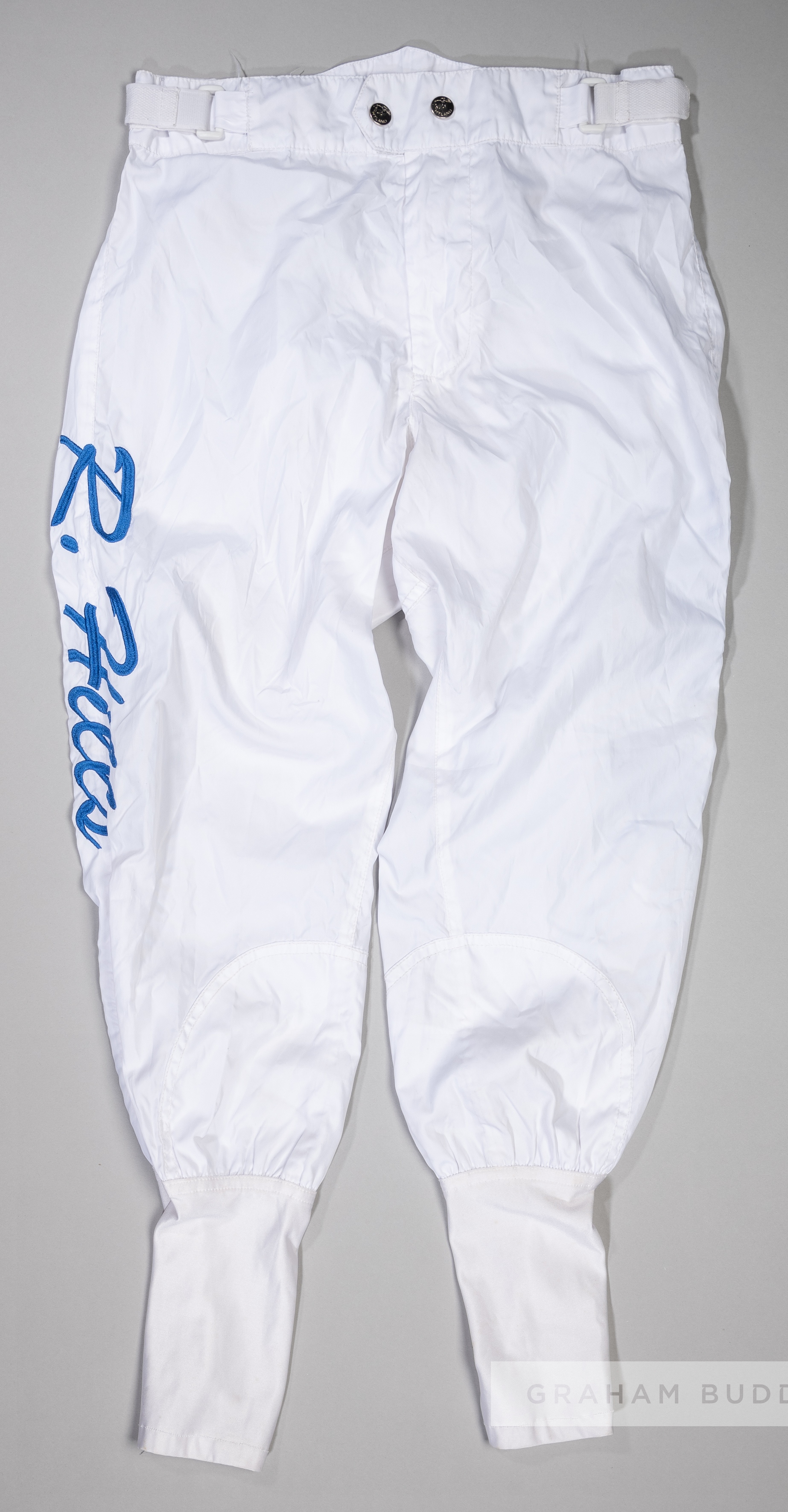 Richard Hills race-worn jockey breeches, with embroidered R. HILLS logo in royal blue, bearing Hyland Sportswear makers label on interior, size M, sl