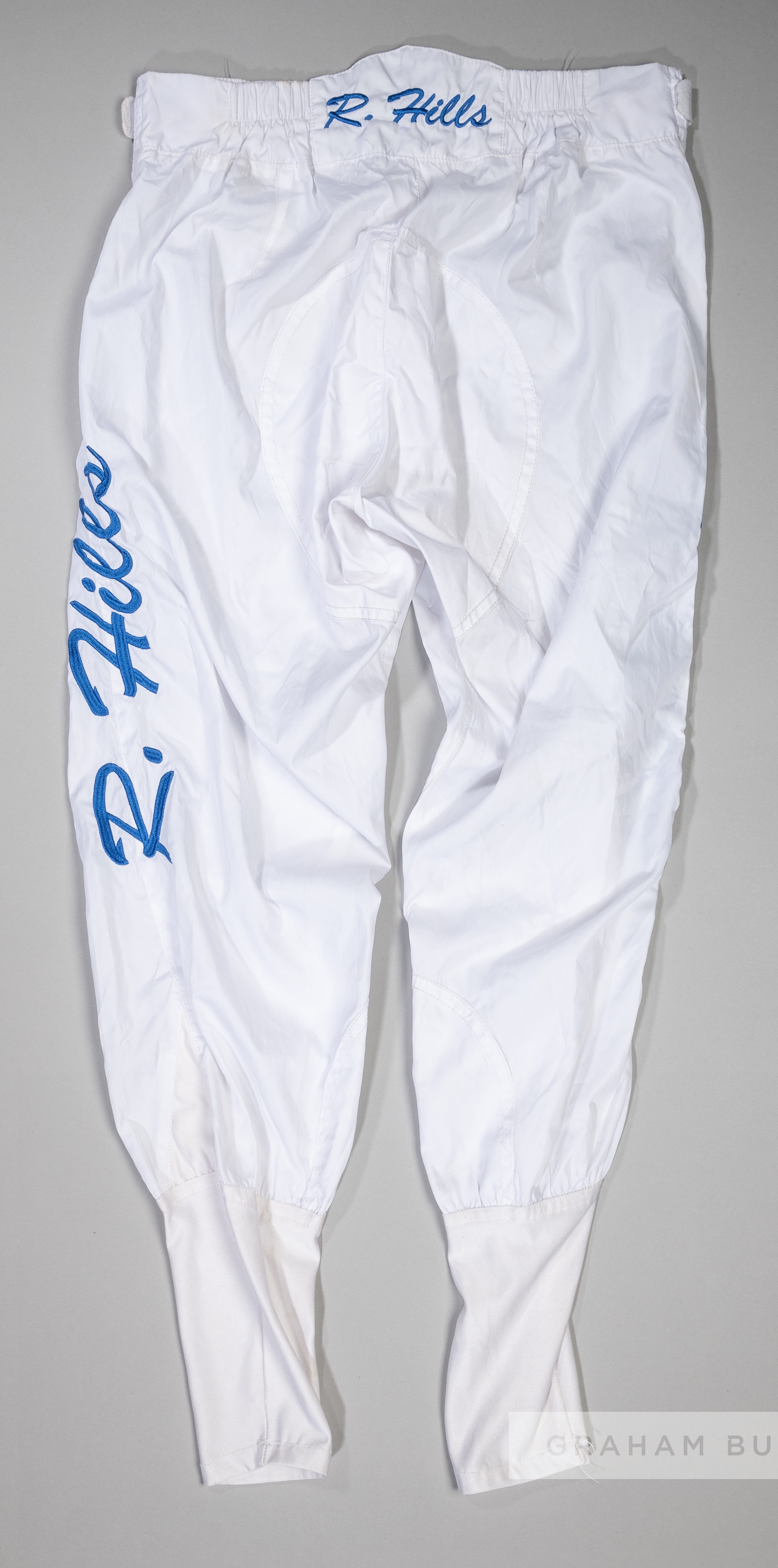 Richard Hills race-worn jockey breeches, with embroidered R. HILLS logo in royal blue, bearing Hyland Sportswear makers label on interior, size M, slight wear