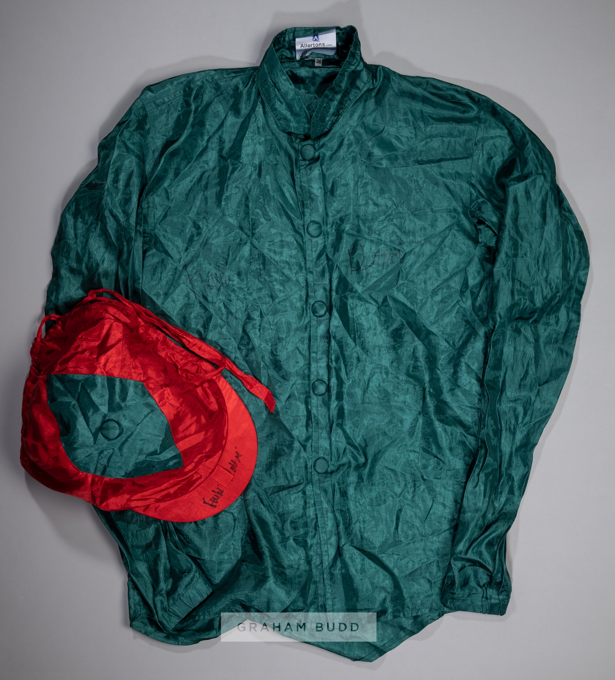 Frankie Dettori signed race-worn silks in the colours of Sheikh Hamdan Bin Mohammed Al Maktoum, from the Mark Johnson stables, the green silks signed in black marker pen to the front, with red cap with green diamond signed with black marker pen, each bearing Allertons makers label