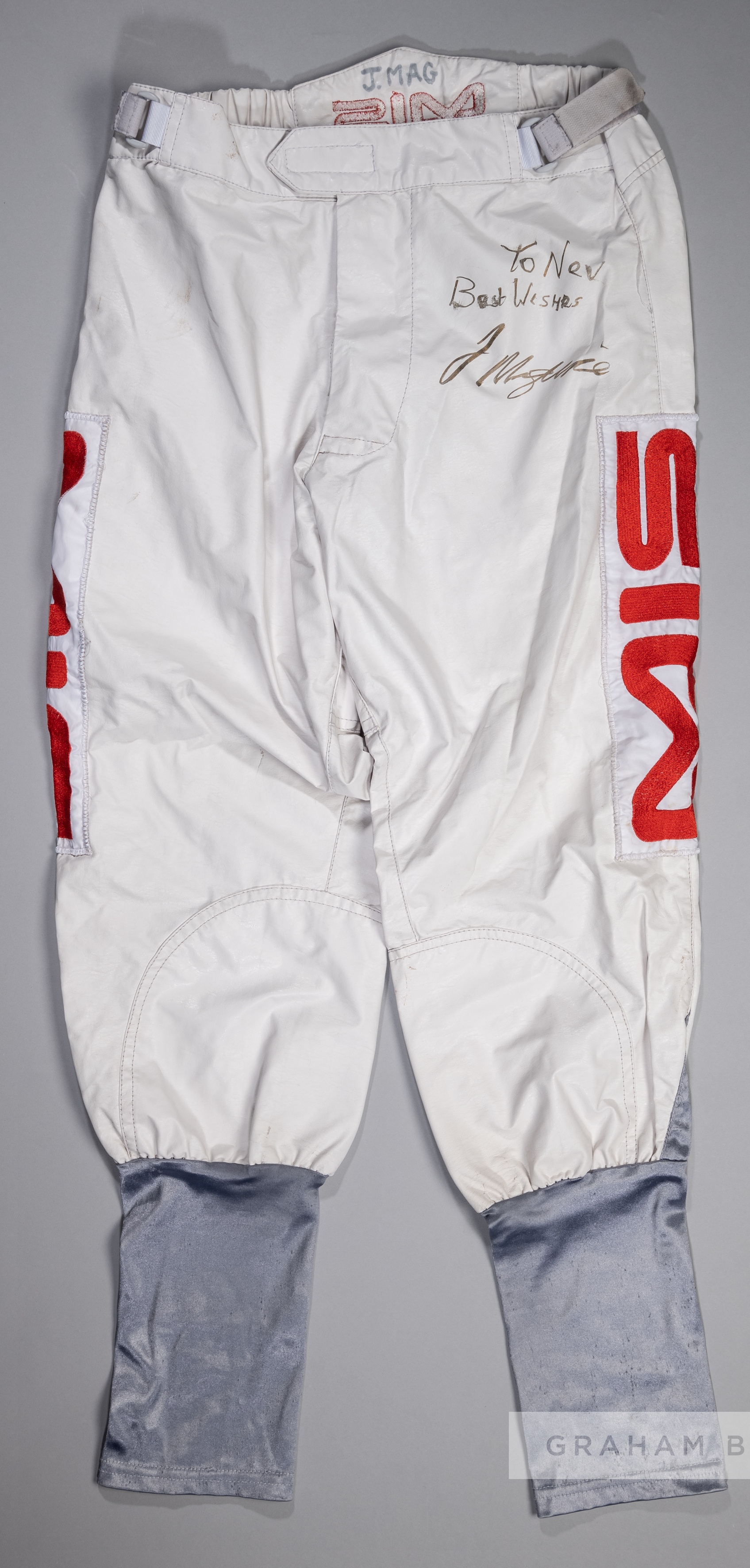 Jason Maguire signed race-worn jockey breeches, signed and dedicated TO NEV, BEST WISHES, J MAGUIRE, in silver marker pen, bearing J.MAG written above, embroidered MIS Motorsport.com logo, Ornella Prosperi makers label on interior, size XL, slight wear