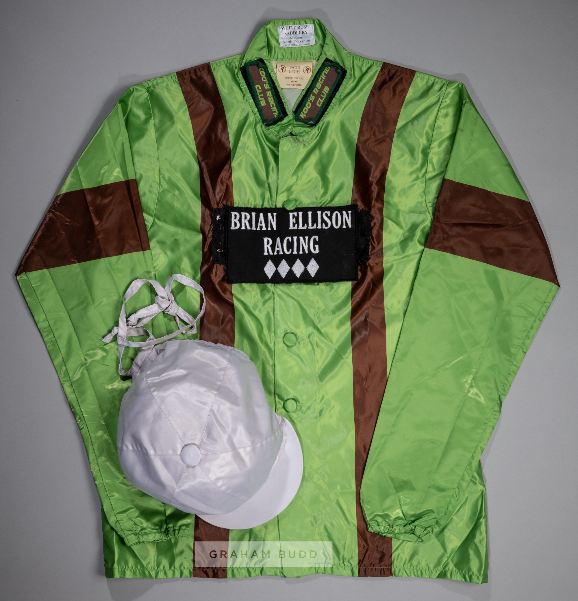 A set of 2012 Grand National race-worn racing silks, for Neptune Equester, at Aintree on 14th April, the lime green silks with brown seams bearing BRIAN ELLISON RACING and KOO'S RACING CLUB embroidered logos, bearing WHITE ROSE SADDLERY and SATIN LIGHT makers labels, with white cap In the 2012 Grand National Neptune Equester was ridden by Felix de Giles, trained by Brian Ellison and finished 13th in the race.