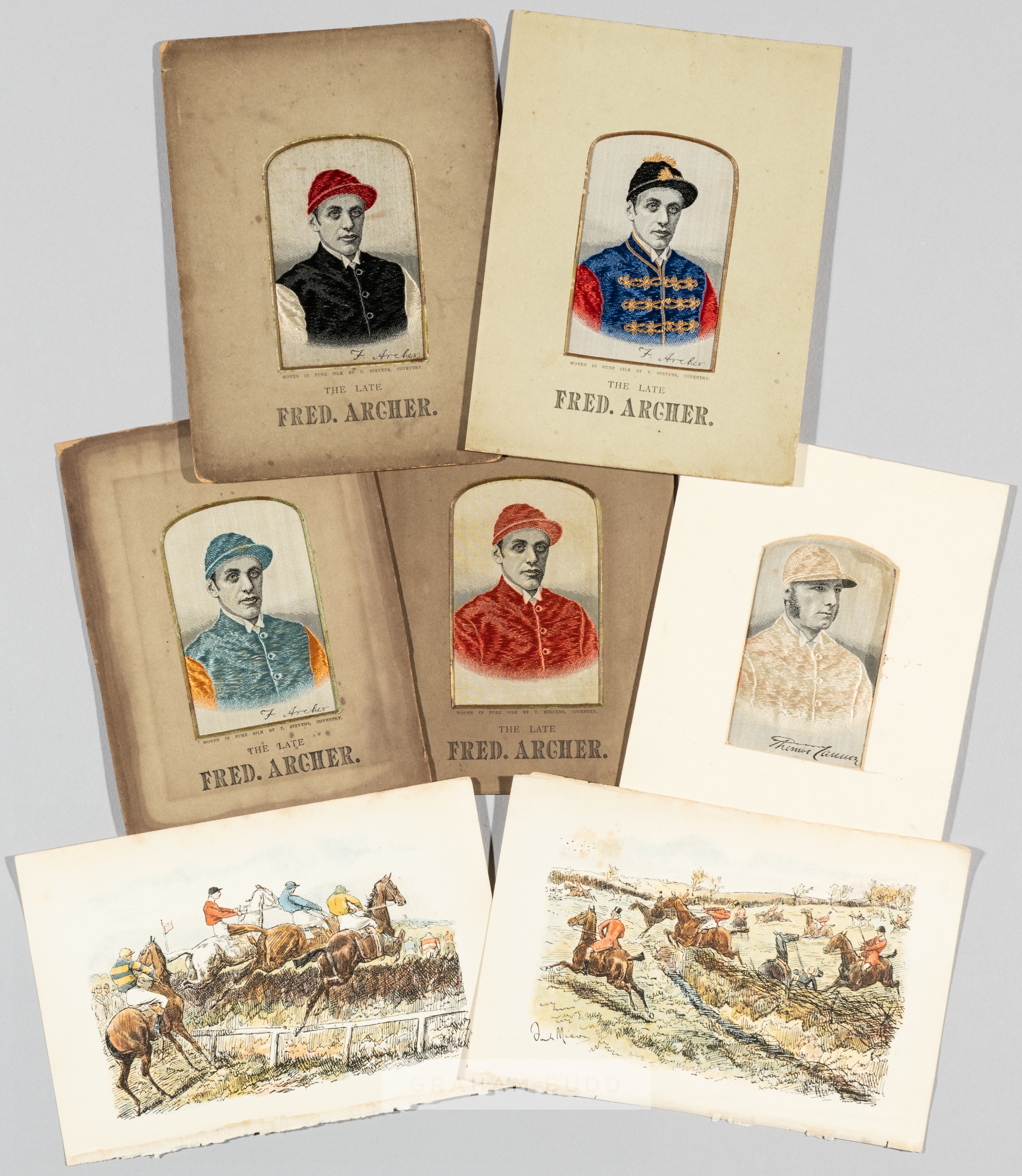 Three stevengraphs of the jockey Fred Archer circa 1886, the first in the Royal Colours of HRH The Prince of Wales, one in the colours of "Mr Manton" (Duchess of Montrose); the other in the colours of Lord Falmouth; the lot also including a fourth stevengraph potraying the jockey Tom Cannon in the colours of Lord Rosebery, published by Thomas Stevens, Coventry, the Cannon lacking the original publisher's printed details to the reverse; the lot also including two colour bookplates after Finch Mason portraying steeplechasing and hunting (6) ...
