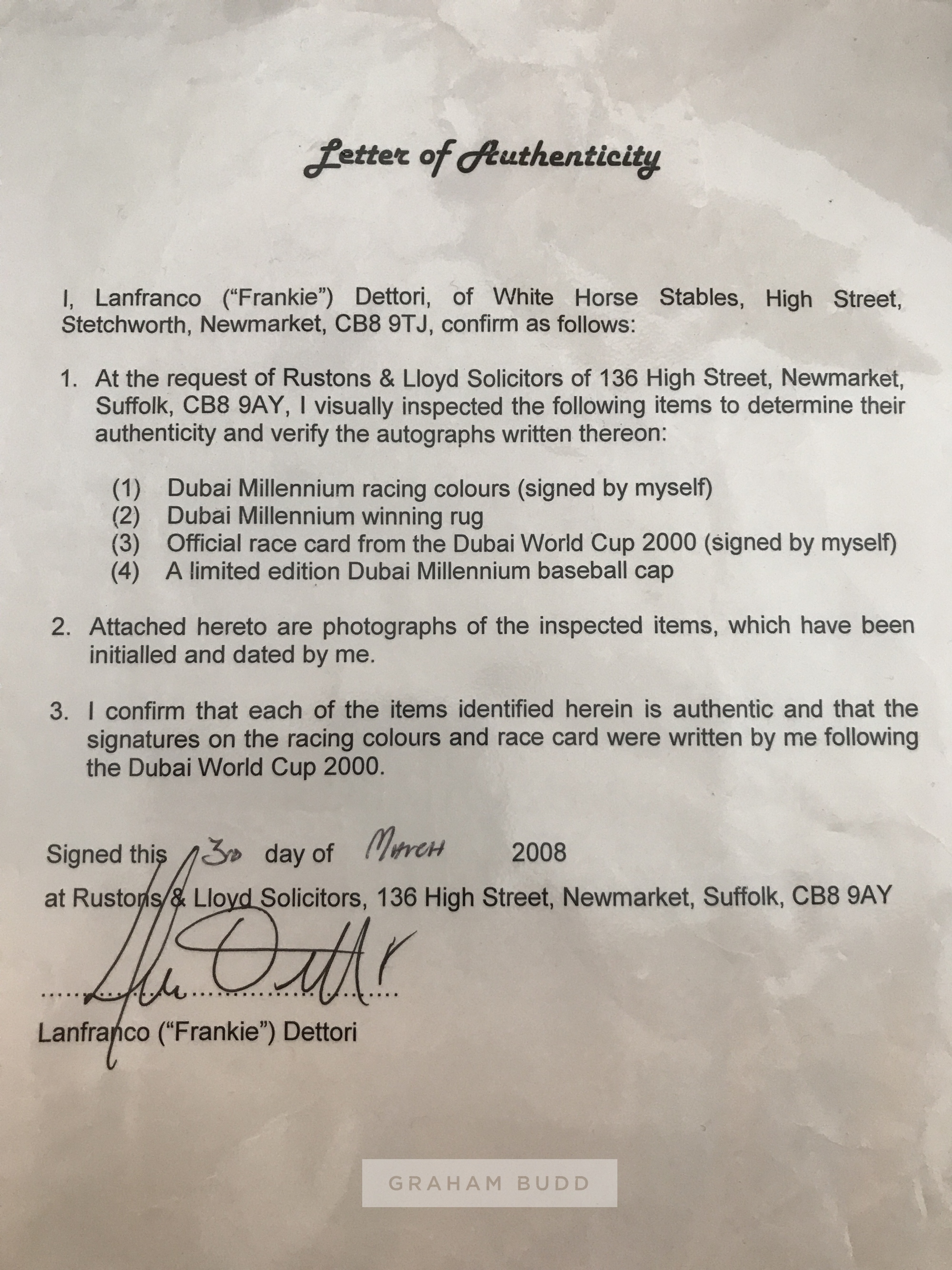 Frankie Dettori signed silks from Dubai Millennium's win in the Dubai World Cup, 25th March 2000, comprising of royal blue jacket silks embroidered in white EMIRATES and signed by Frankie Dettori in black marker pen and cap; sold with two race cards for the meeting and four colour photographs of the race and celebrating the race win with owners; offered with a LOA signed by Frankie Dettori and dated 30th March 2008 (8) Dubai Millennium was owned by Godolphin and trained at Newmarket by Saeed bin Suroor.