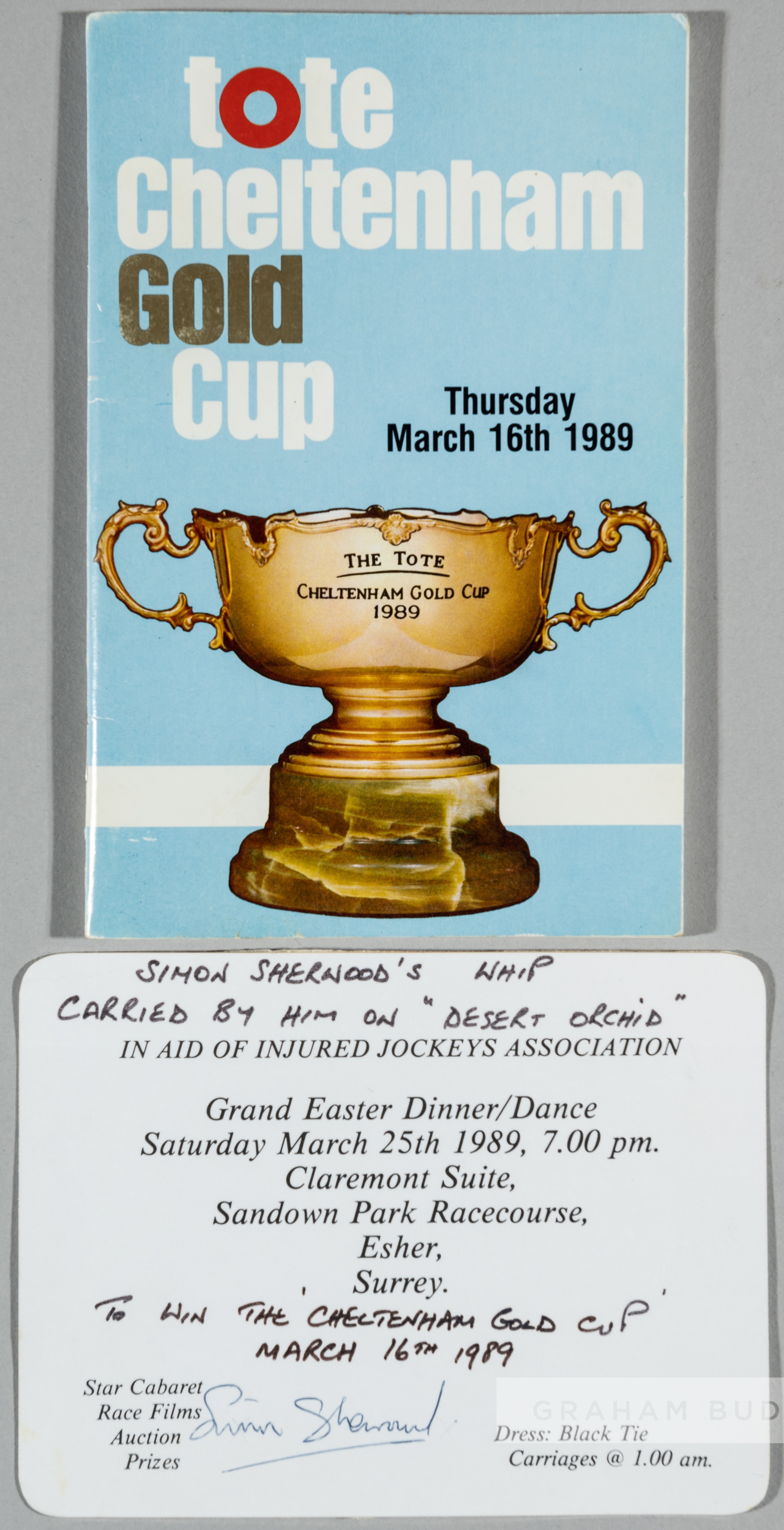 Simon Sherwood's whip used when riding Desert Orchid to glory at the Cheltenham Gold Cup on 16th March 1989, the red whip with white rubberized handle and brown leather tip, mounted below three colour photographs of the win at Cheltenham in 1989, with engraved plaque below, glazed and framed, overall 45 by 86cm., sold together with race card for the event and a Simon Sherwood signed Grand Easter dinner/dance invitation 25th March 1989 in aid of injured jockeys association, with provenance details of the whip, (3) Please be aware all glass will be removed from framed and glazed items prior to posting and may result in delays to shipping your items. (This service is included in the cost of postage and packing). We can also totally remove all framing and mounts upon request to reduce shipping costs. Alternatively lots can be collected in person by prior appointment from NN8 1RT.