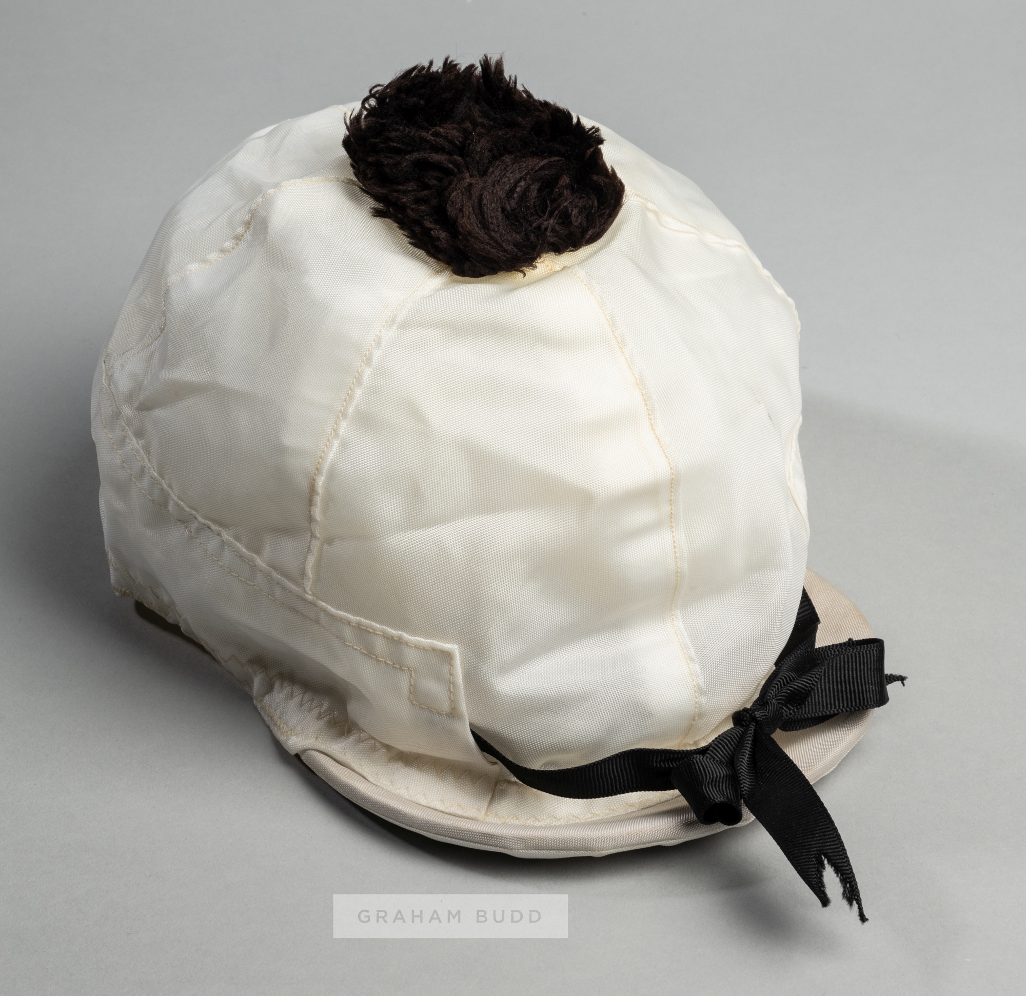 Jockey cap movie prop from the 2003 Hollywood movie 'Seabiscuit', the white cap with black bow above the peak with black pommel, the interior embroidered with BUD YOUNGER and bears N.3W in black marker pen, sold with bill of sale from Premiere Props Inc., USA Provenance: Item 2477 Premiere Props Inc.
