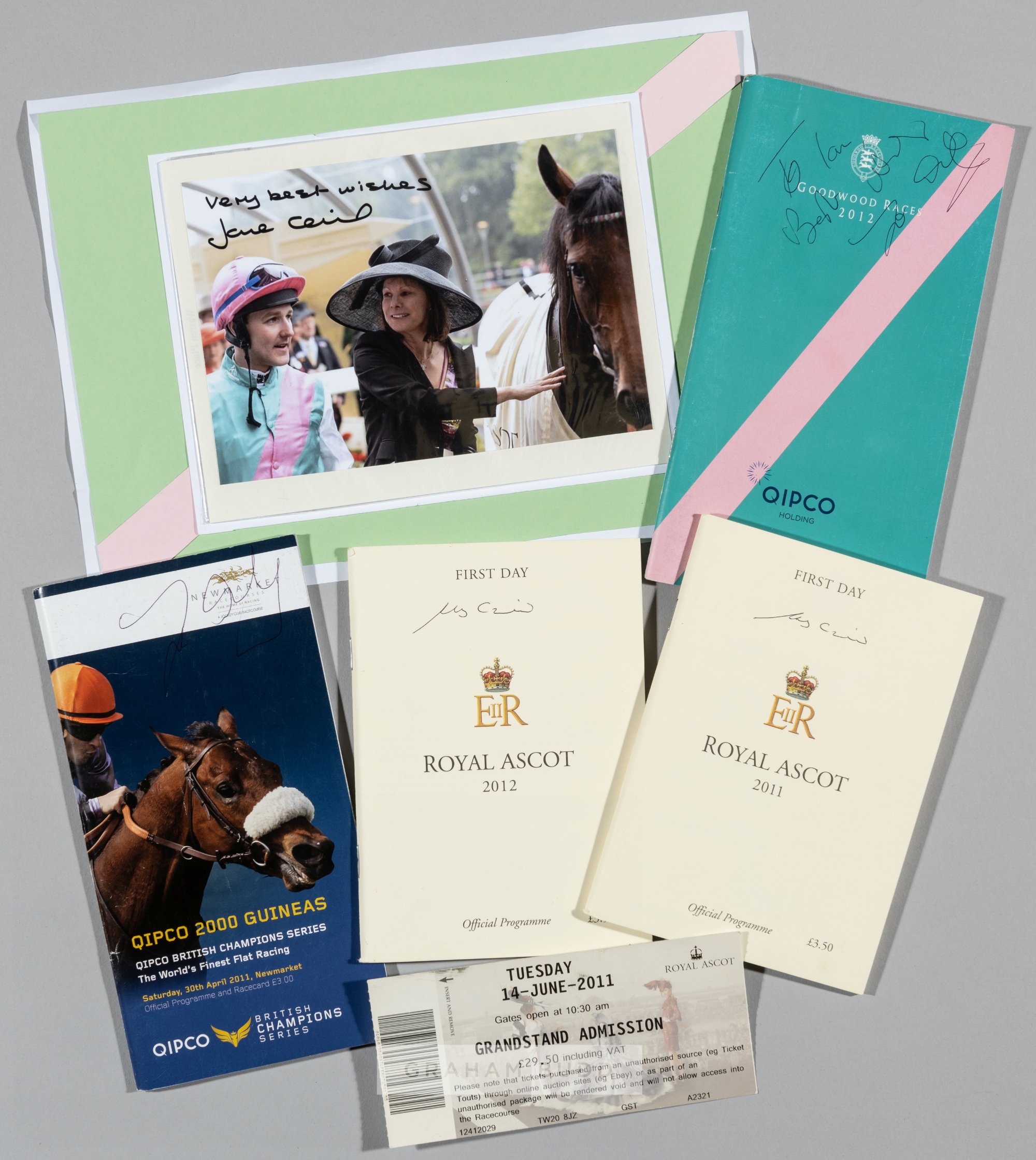 Memorabilia relating to the champion racehorse Frankel, including 2011 and 2012 Royal Ascot race cards, both signed by Sir Henry Cecil, 2000 guineas