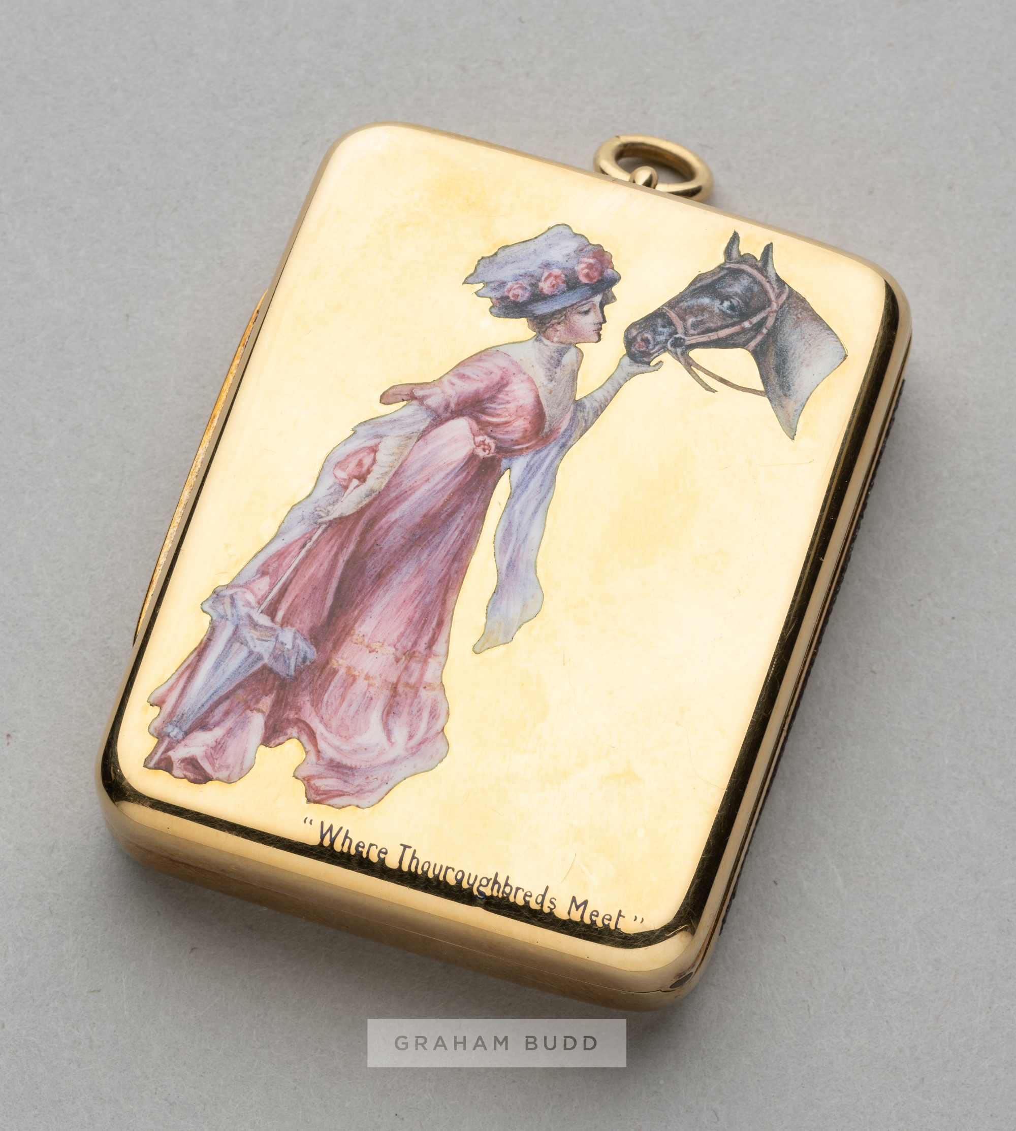 Rare and fine quality Percy Edwards 18ct. gold and enamel Edwardian Royal Ascot inspired horse racing vesta case titled "Where thoroughbreds meet", the enamel featuring an immaculately dressed lady petting a racehorse, rectangular vesta case with suspension ring, hallmarked 18ct.. London, 1909, Percy Edwards Ltd, weight 47gm., 50 by 38 by 8mm., in fine condition with little wear, with a felt cover and in associated case