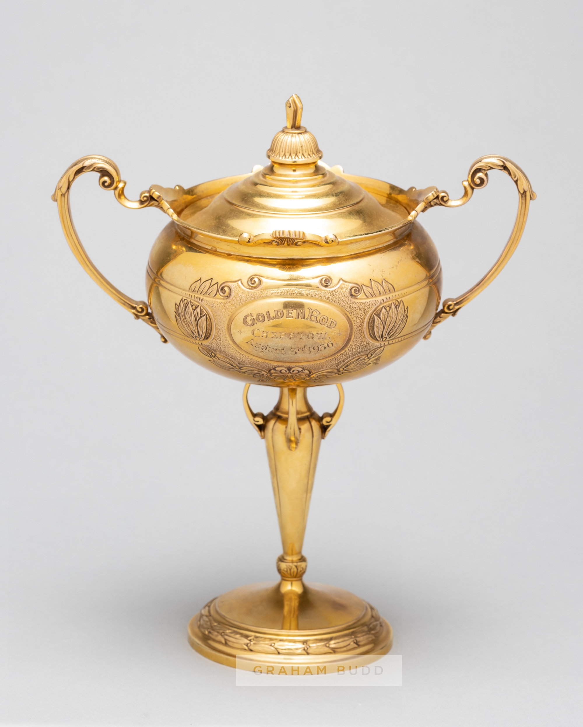 Gold horse racing trophy for the 1936 Chepstow Summer Cup, a 9ct. gold twin handled cup and cover by Fattorini & Sons Ltd., Birmingham, 1936, on a slender shaped pedestal, laurel decorated base and reserved panel inscribed GOLDEN ROD, CHEPSTOW, AUGUST 3rd 1936, height 19.5cm., weight 241gr., cup somewhat leaning forward, no damage Golden Rod was a chestnut colt by Pick Of The Circus our of Bridle Goose. He was owned by Miss P Davies, trained at Ogbourne by Martin Hartigan and ridden by Gordon Richards. The Champion jockey had been apprenticed to Martin Hartigan's yard and continued to ride for him when available. Golden Rod took advantage of huge weight concessions in the Chepstow Summer Cup receiving 22lb from the runner-up and 20lb from the third to win the mile race by 1 1/2 lengths. Provenance: Sotheby's New Bond Street Saleroom, London, Sporting Sale, 18th July 2001, Lot 467.