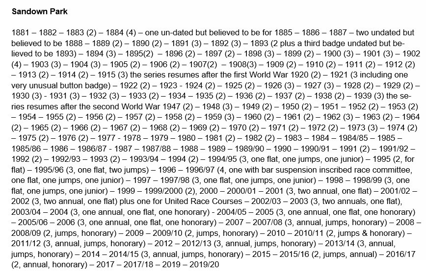 Horse racing: a superbly assembled private collection of Sandown Park members' badges dating from 1881 to 2020, the collection displaying the numerous designs of the racecourse's badges, including variations within annual issues, mostly but not exclusively in gilt-metal & enamel, later with chords, overall in very good condition, and the collection is housed in a custom-made wooden collector's cabinet, with five compartmentalised drawers, the lot offering an instant collection of Sandown Park badges that conversely took the present consignor a lifetime of collecting to amass Please see image for a full inventory of this collection