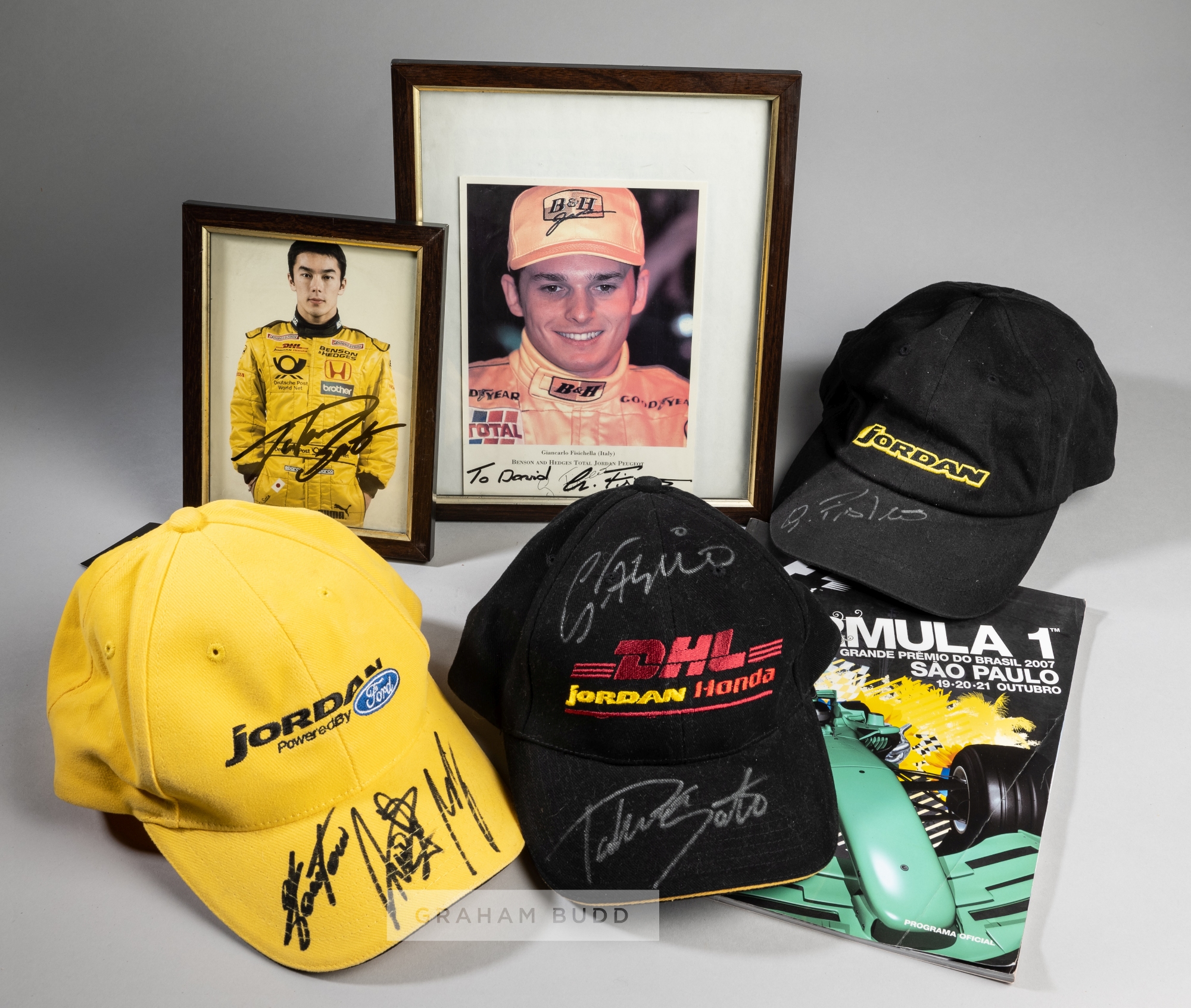 Signed Formula 1 memorabilia, comprising black Jordan Honda DHL cap signed in silver marker pen by Giancarlo Fisichella and Takuma Sato; a black Jordan Puma cap signed by Giancarlo Fisichella; a yellow Jordan powered by Ford signed by three F1 drivers; sold with a 7 by 5in. Takuma Sato signed press photograph, framed and glazed; a 8 by 5in. Giancarlo Fisichella signed press photograph, framed and glazed and a Formula 1 Grande Premio Do Brasil 2007 programme, (6). Please be aware all glass will be removed from framed and glazed items prior to posting and may result in delays to shipping your items. (This service is included in the cost of postage and packing). We can also totally remove all framing and mounts upon request to reduce shipping costs. Alternatively lots can be collected in person by prior appointment from NN8 1RT.