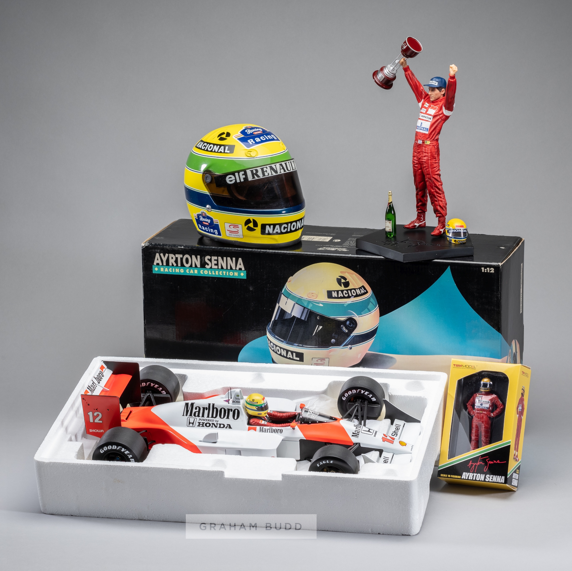 Ayrton Senna themed collection of various Minichamps model cars and assorted figurines (12) FW14 540911805 - Lotus 540851812 - McLaren Honda 540921801 - Lotus Renault 540861812 - Lotus Honda 540871812 - McLaren Honda 540901827 - McLaren Ford 540931808 - William Renault 540941802 McLaren MP4-4 540881212 (1:12) TSM 1:18 scale Senna Figurine - Artscale 1:10 Senna Figurine Japan GP 1988 - Minichamps 1:2 scale helmet 1994