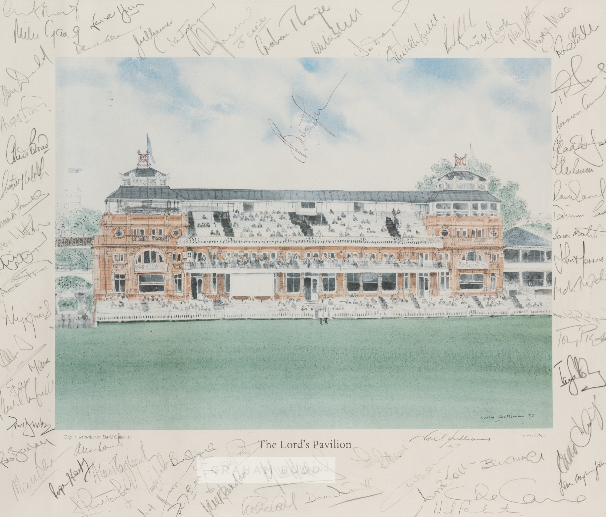 Signed "The Lord's Pavilion Test Cricketers" print, signed in pencil by approximately 70 test cricketers in the margin surrounding the print of original watercolour by David Gentleman. Signatures including Gatting, Gower, Emburey, Thorpe, Cook, Moxon, Cowans, Morris, Pigott, Broad, Walsh, Lamb, Frazer, Tufnell, Hussain, central image signed by Brian Lara and many others. Mounted, glazed and framed, overall size 59 by 67cm. Please be aware all glass will be removed from framed and glazed items prior to posting and may result in delays to shipping your items. (This service is included in the cost of postage and packing). We can also totally remove all framing and mounts upon request to reduce shipping costs. Alternatively lots can be collected in person by prior appointment from NN8 1RT.