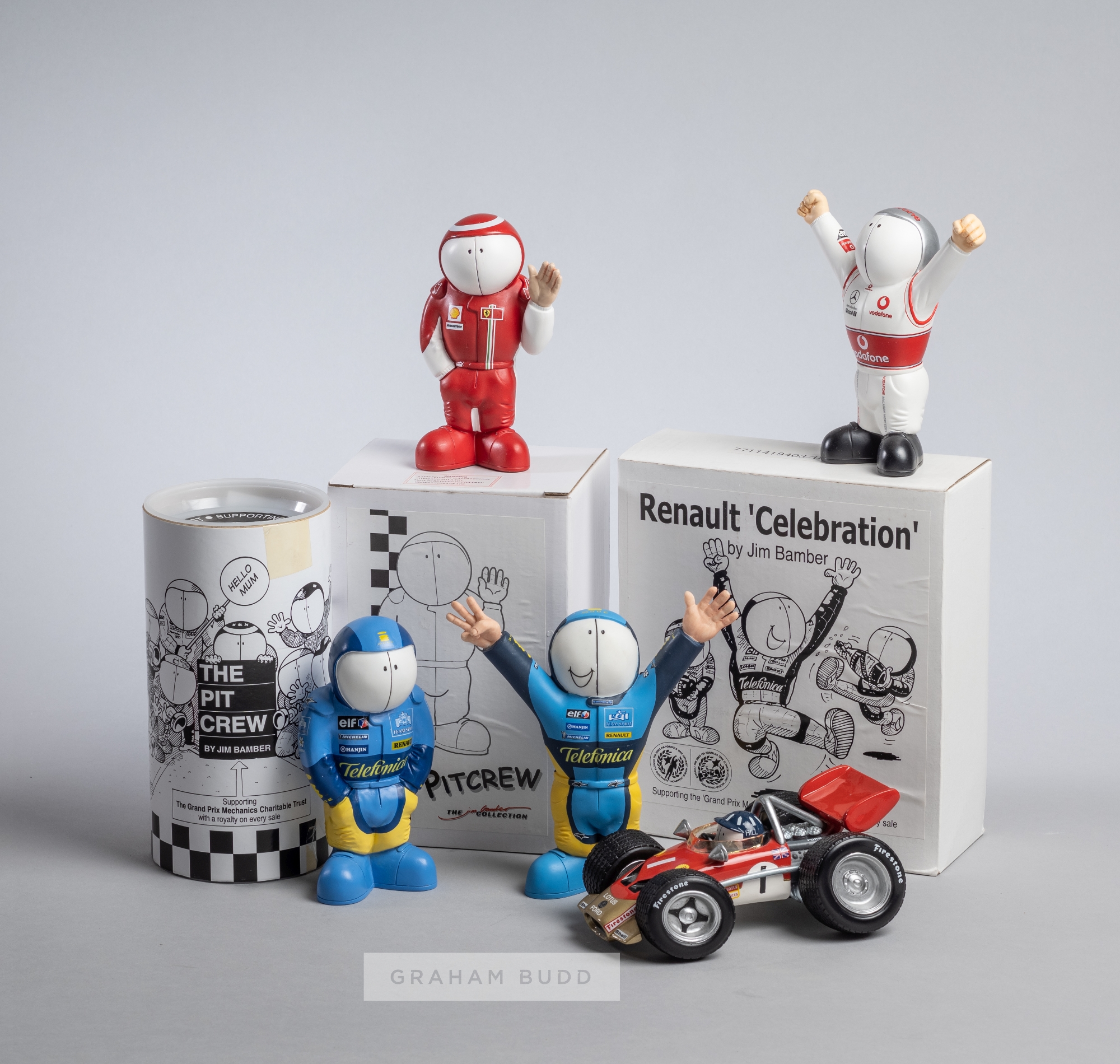 Group of "Pitcrew" caricatures by Jim Bamber, including McLaren and Renault Celebration, all in original boxes, (11)