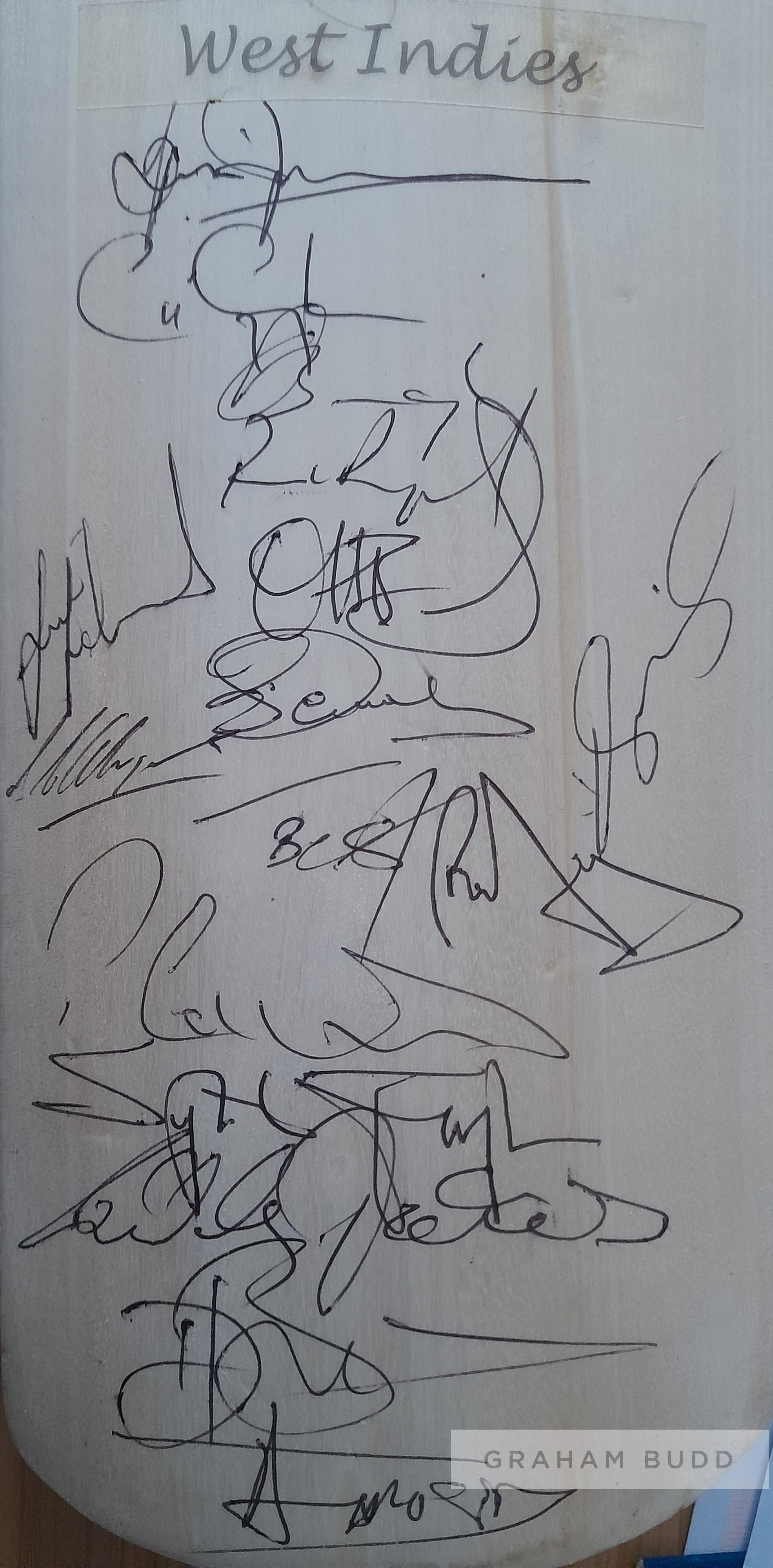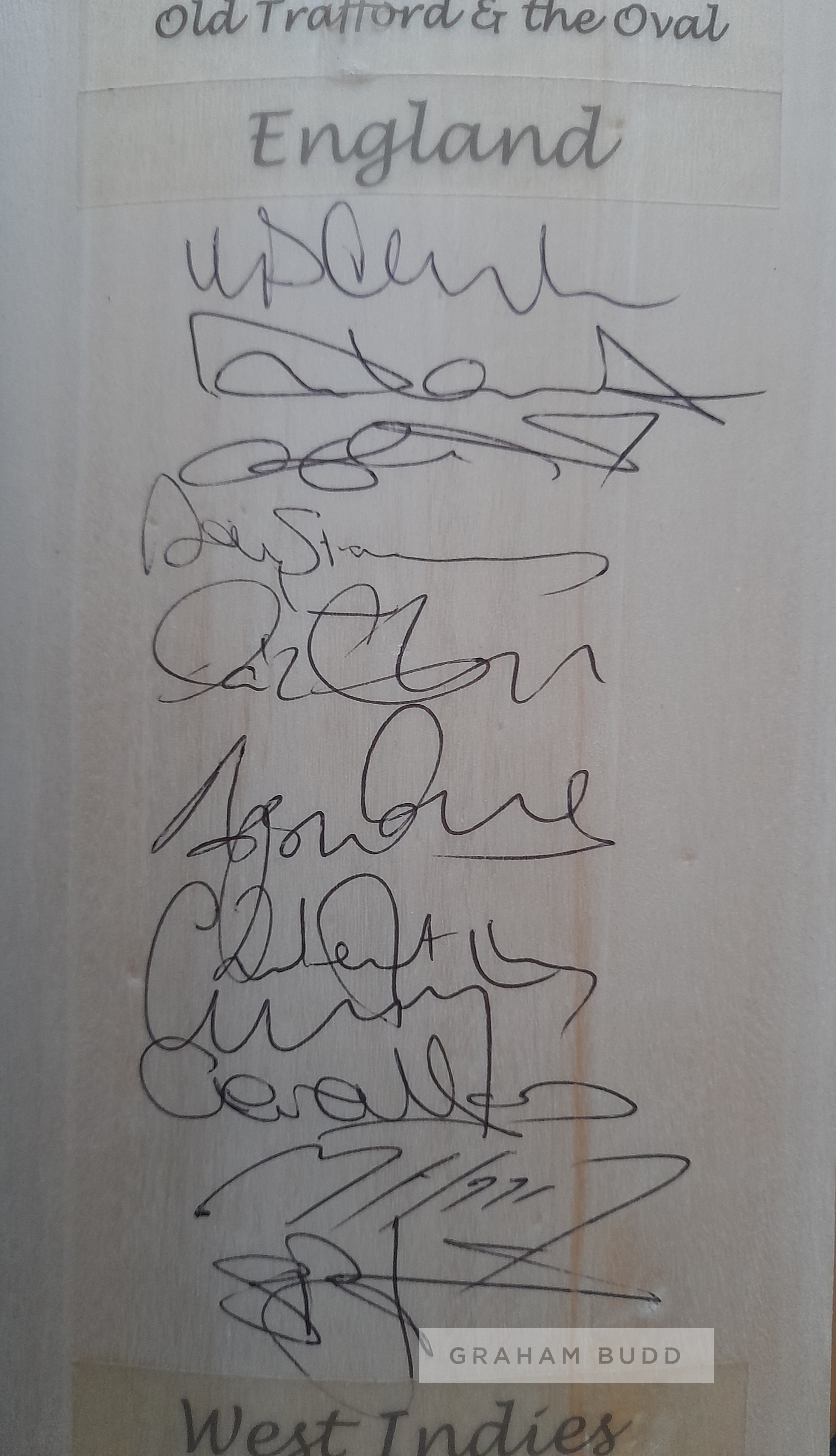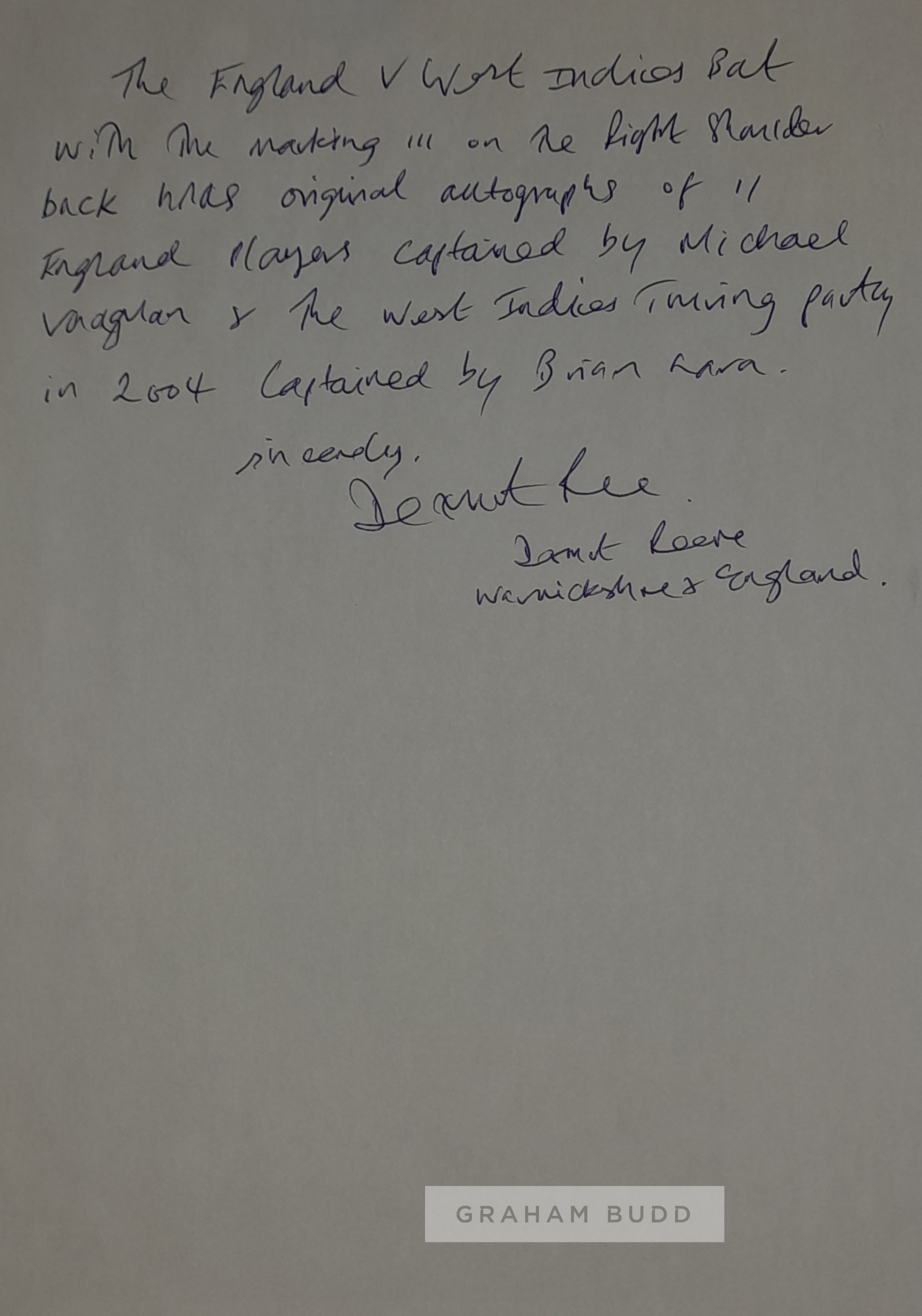 England v West Indies full squads signed full size bat commemorating the 2004 Npower test series between these two great cricketing nations, tests were at Lords, Edgbaston, Old Trafford and The Oval, England autographs Andrew Strauss, Rob Key, Michael Vaughan (c), Graham Thorpe, Andrew Flintoff, Geraint Jones, Ashley Giles, Matthew Hoggard, Ian Bell, Simon Jones and Steve Harmison. West Indies autographs Chris Gayle, Devon Smith, Brian Lara, Ramnarwesh Sarwan, Shivnarine Chanderpaul, Dwayne Bravo, Ridley Jacobs, Omari Banks, Tino Best, Pedro Collins, Fidel Edwards, Sylvester Joseph, Ian Bradshaw, Jermaine Lawson, Carlton Baugh and Dwayne Smith England would go onto complete a 4-0 rout in this series. Provenance: originally the property of Warwickshire & England cricketer Dermot Reeve (accompanying letter included stating so).