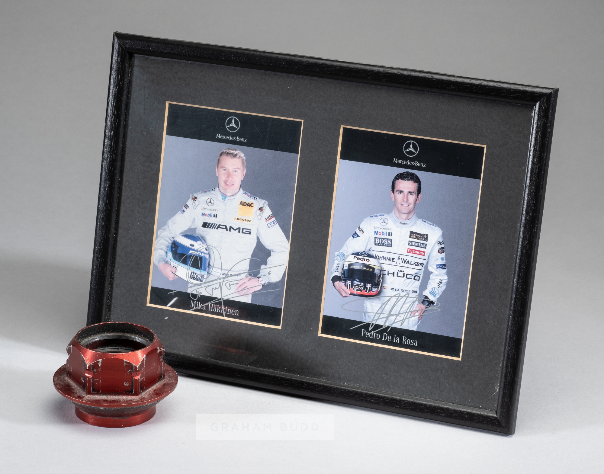 Collection of F1 ephemera, including signed F1 driver profile cards and photographs of Massa, Hakkinen and De la Rosa; sold together with Jordan race used wheel nut 2006 and certificate, Ferrari pit-crew black shirt, stickers, photographs, lanyards, etc., (qty)