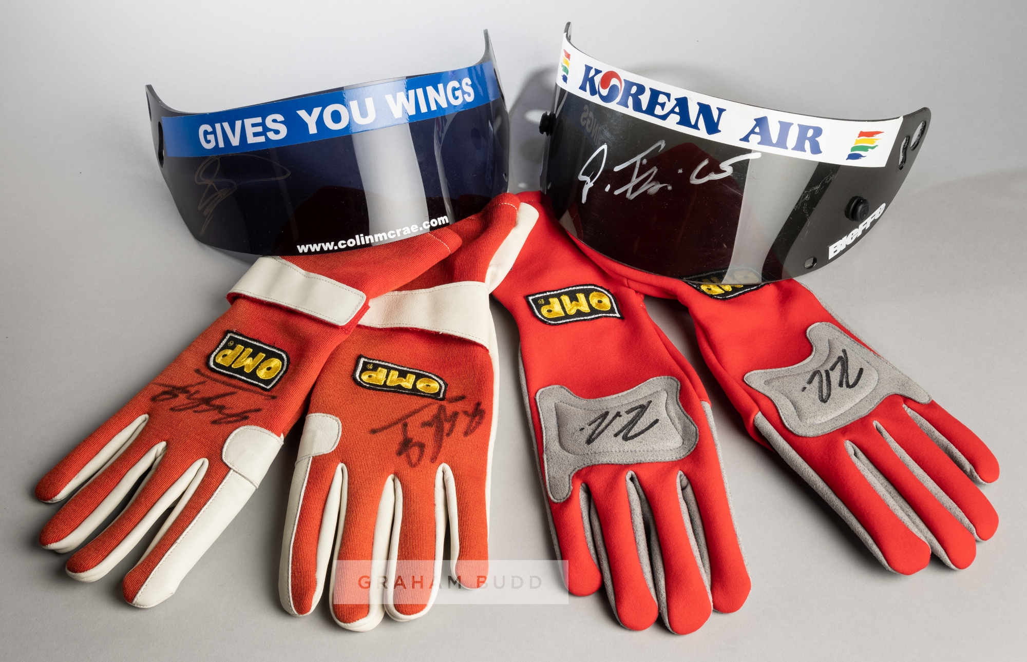 Two pairs of F1 drivers gloves, one pair signed by Michael Schumacher and the other by Felipe Massa, singed in black marker pan, sold together with two helmet visor's signed by Giancarlo Fisichella, one is Red Bull and the other Benneton, one signed in silver and other in gold marker pen, (4)