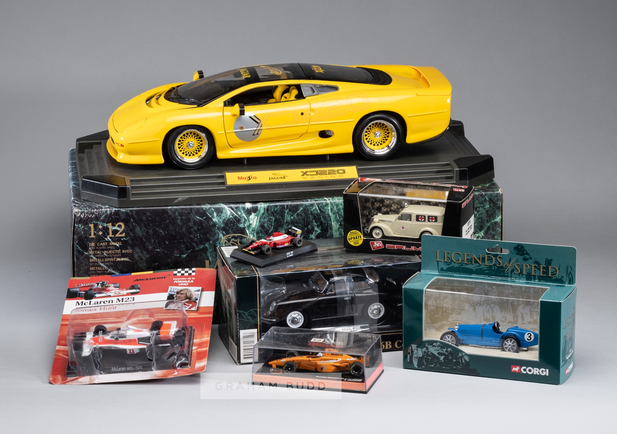 Over 40 model cars covering a variety of scales and several Manufacturers Including 6 x Hotwheels 1:43, 2 x Brumm 1:43, 5 x Minichamps 1:43, 1 Revel Auto Union 1:18, 1 x Maisto Jaguar XJ220 1:12, 9 x Kyosho Ferrari 1:64 kits, 3 x Corgi Legends of Speed, 1 x AutoArt Le Mans Toyota 1:18 Minichamps Williams set 402969701, box of assorted small scale F1 cars, (40)