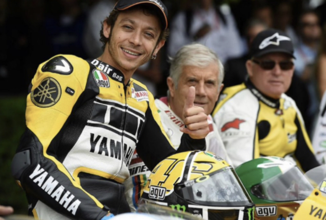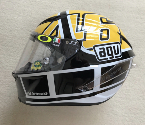 Valentino Rossi "Goodwood 2015" AGV factory replica helmet, official factory replica helmet by AGV / Drudi Performance as used by the legendary Valentino Rossi./ VR46 at Goodwood in 2015. This unique design was only sported by the nine times motorcycle World Champion during his appearance at the 2015 Goodwood Festival of Speed with his R1 Yamaha presented in similar graphics for the event. The design is based upon the 70s yellow with black and white “speed block” motif used by Team Yamaha in period with Kenny Roberts, but also incorporating Vale’s “46”. The Corsa R helmet is unused and is of mixed carbon and fibreglass construction, sized 60-61 / L and additionally bears the correct visor decals of Oakley / Monster Energy and VR46 and has tear-offs fitted. It comes with its AGV helmet bag, original box and packaging and is fully approved with full regulatory approvals for road use in the UK.