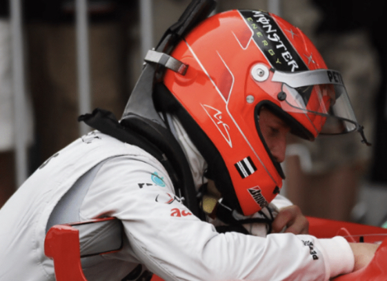 Michael Schumacher 2010 replica AMG Mercedes helmet, A superb 1:1 display replica of the Schuberth helmet used by Michael Schumacher in his comeback season with Mercedes in 2010. This helmet with dark smoke visor bears sponsors logos of Monster Energy, Bridgestone and Mercedes on fluo-red paintwork and has the Petronas logo on the visor strip. Michael’s trademark 7 stars representing his WDC titles are on the crown as well as his personal MS logo. It has a FIA accreditation sticker replicated to the rear as well as integral HANS device straps but please note that this unofficial replica is for display only and not Snell rated for use.